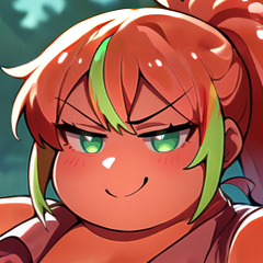 Physical Prompts 1girl, solo, red hair, streaked hair, green highlights, ponytail, long hair, bangs, green eyes, asian, (dark skin:1.2), gyaru