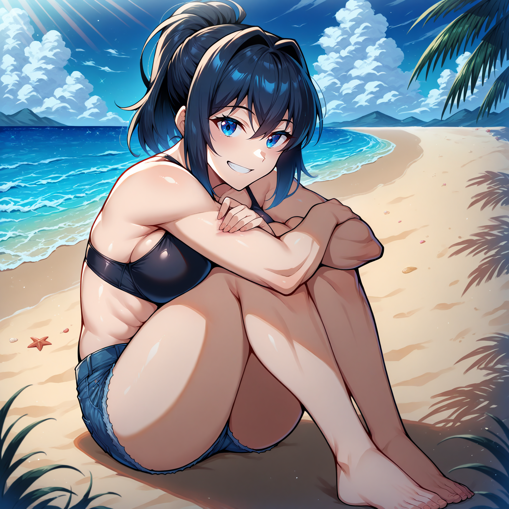 Outfit Prompts black bra, denim shorts, swimsuit, barefoot