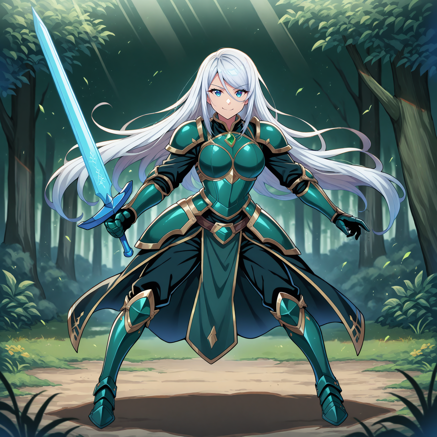 Outfit Prompts full armor, green armor, shoulder armor, green gemstone, armored boots, armored gloves, chestplate, armored skirt, dark green shirt, dark green pants, gold trim