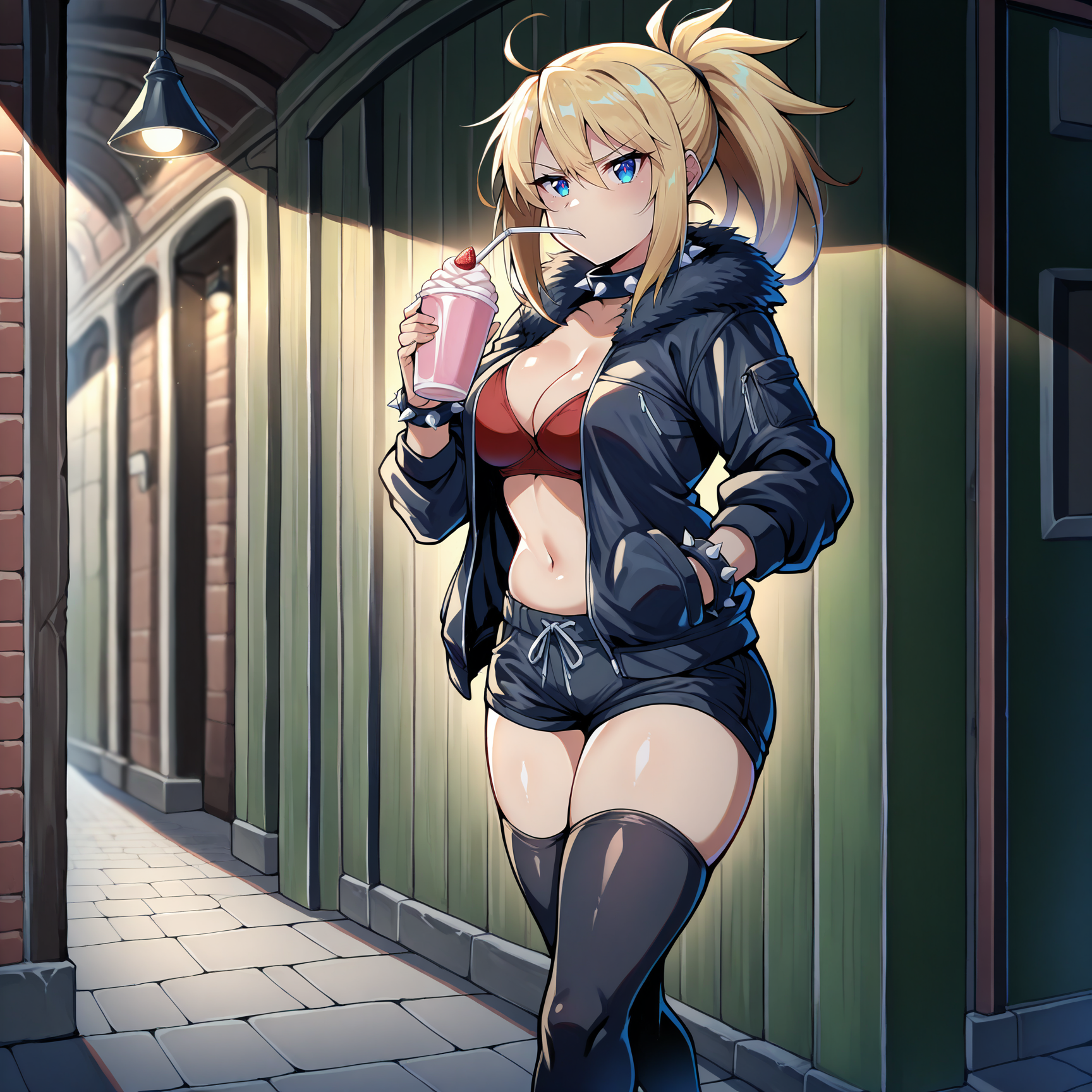 black jacket, fur jacket, open jacket, red bra, black shorts, red sandals, spiked hair tie, spiked collar, spiked bracelet, spiked anklet, edgy, (mysterious heroine x /(fate grand order/):0.4), navel, black thighhighs