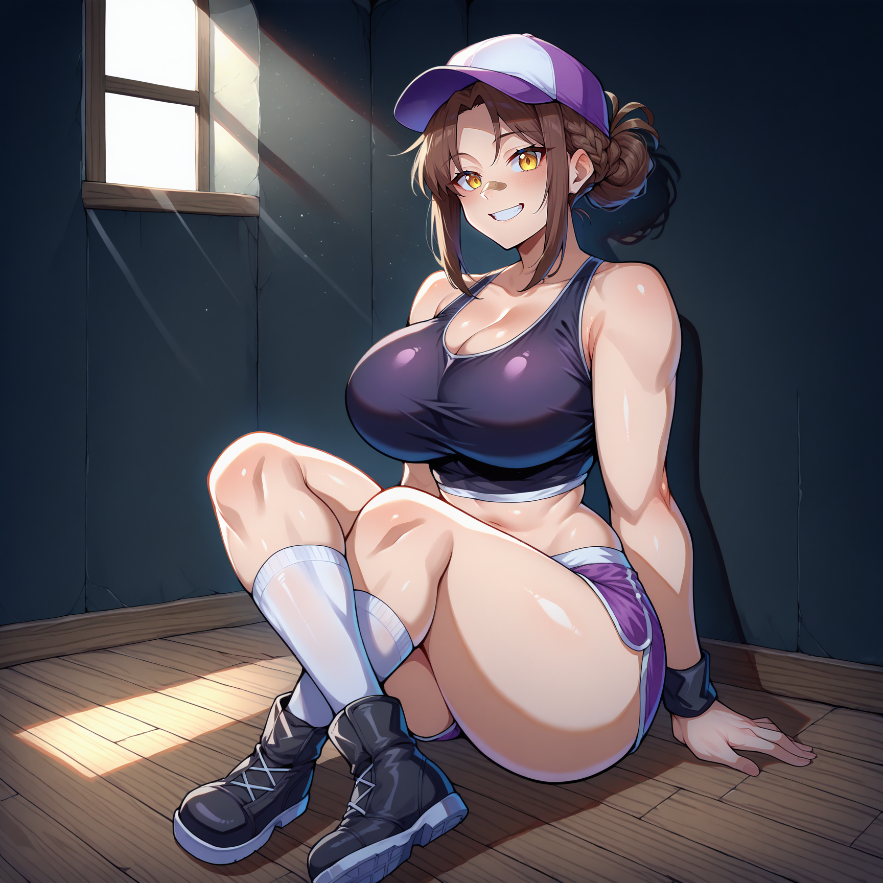 bandaid on nose, purple hat, baseball cap, midriff, black shirt, sleeveless, cleavage, black armband, black wristband, purple shorts, dolphin shorts, white thigh belt, white kneehighs, black boots, ankle boots