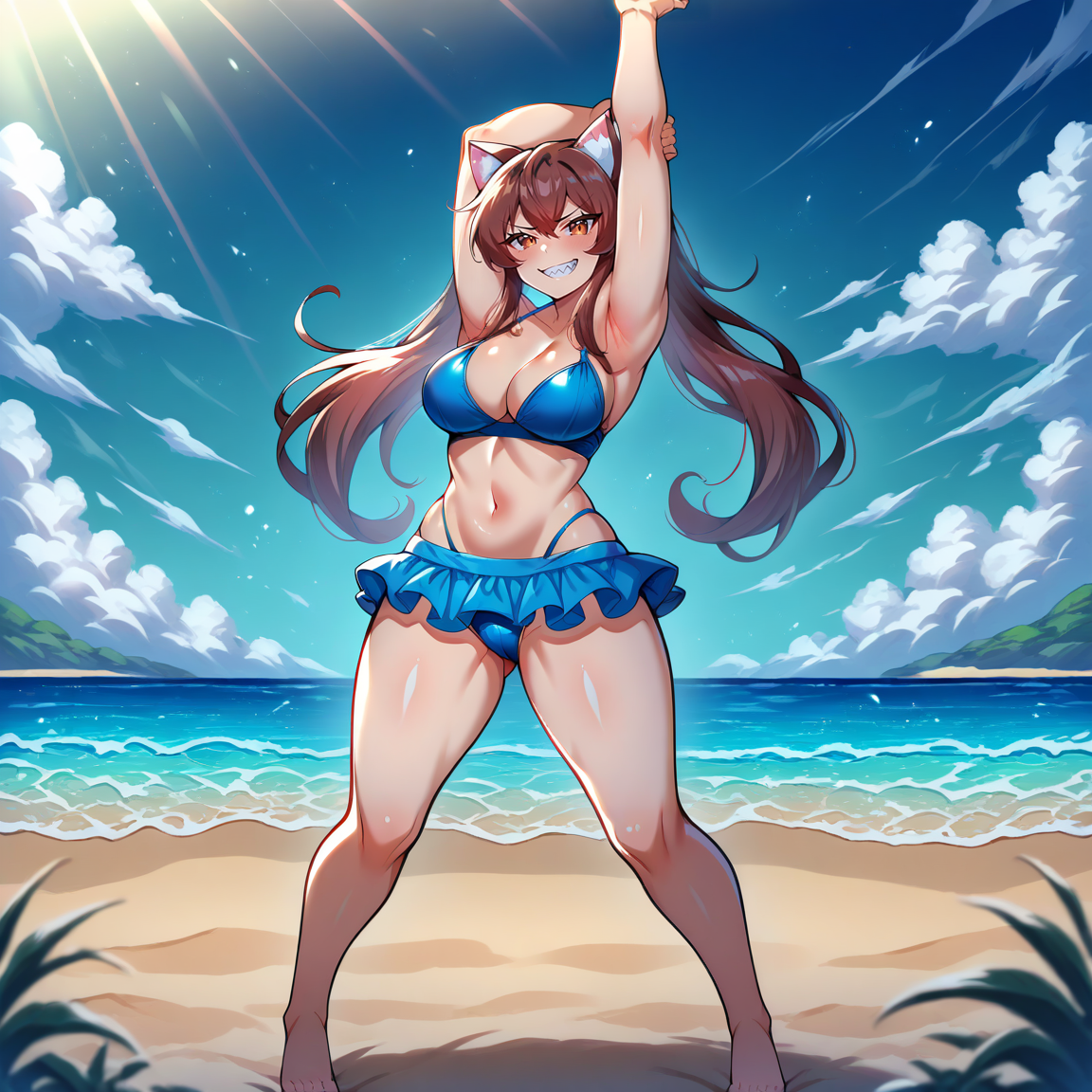 Outfit Prompts blue bra, swimsuit, blue skirt, frilled skirt, swimsuit skirt, microskirt, blue panties, highleg swimsuit, barefoot