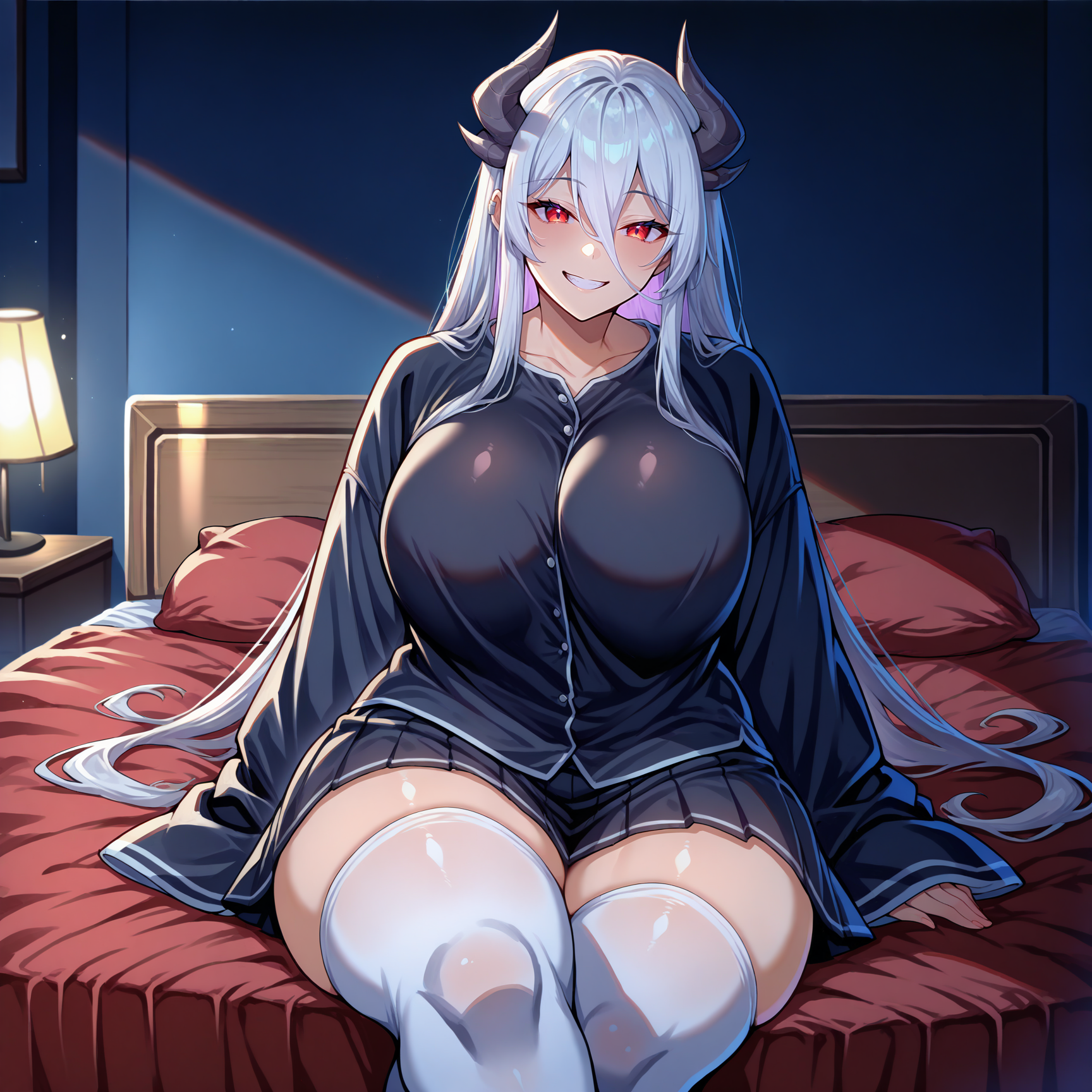 Physical Prompts 1girl, solo, white hair, hair between eyes, long hair, straight hair, horns, dragon horns, dark grey horns, red eyes
