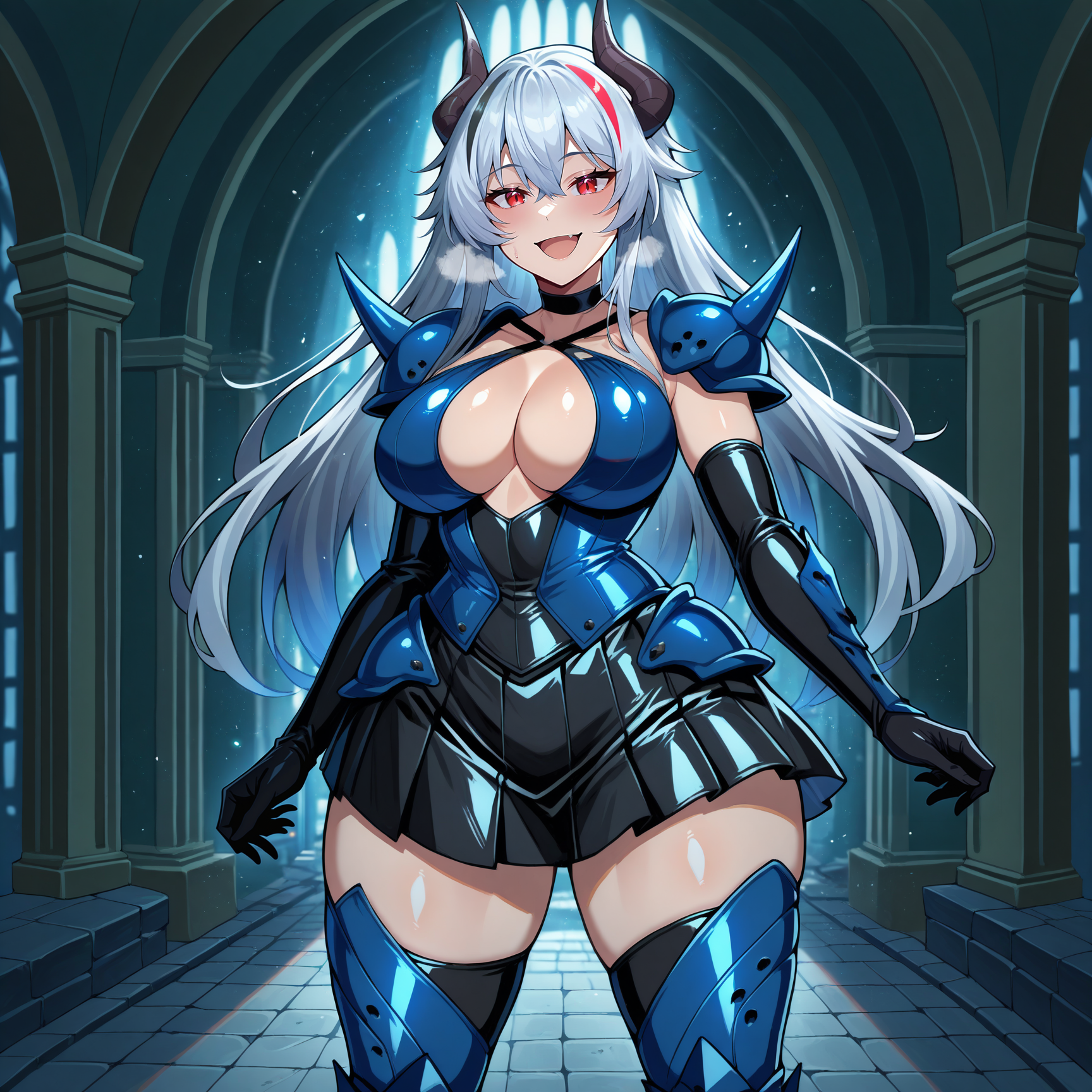 1girl, solo, white hair, hair between eyes, long hair, straight hair, streaked hair, blue streaks, dragon girl, horns, dragon horns, dark gray horns, slit pupils, red eyes