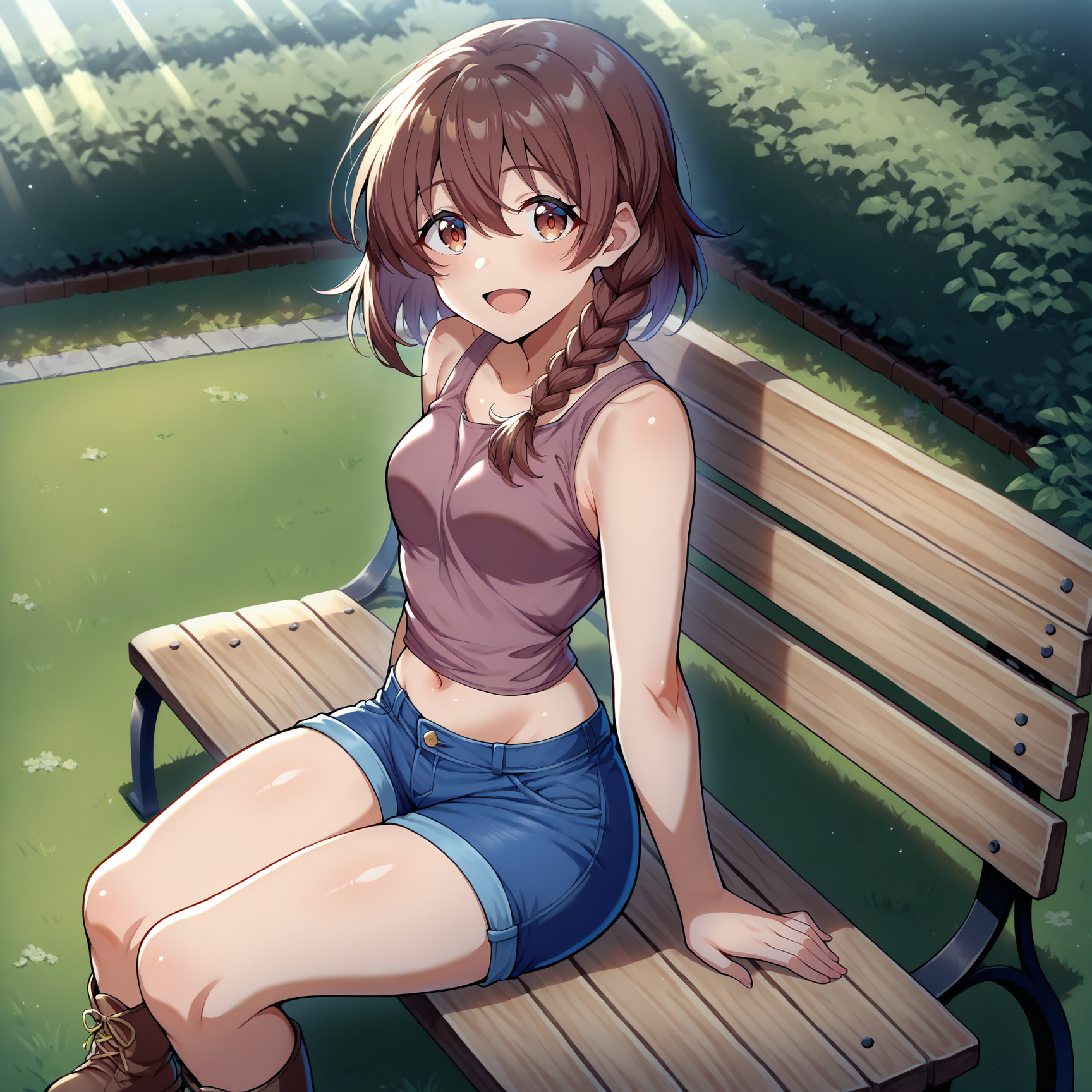 Outfit Prompts dark pink tank top, navel, sleeveless, blue shorts, denim shorts, knee shorts, long shorts, brown boots