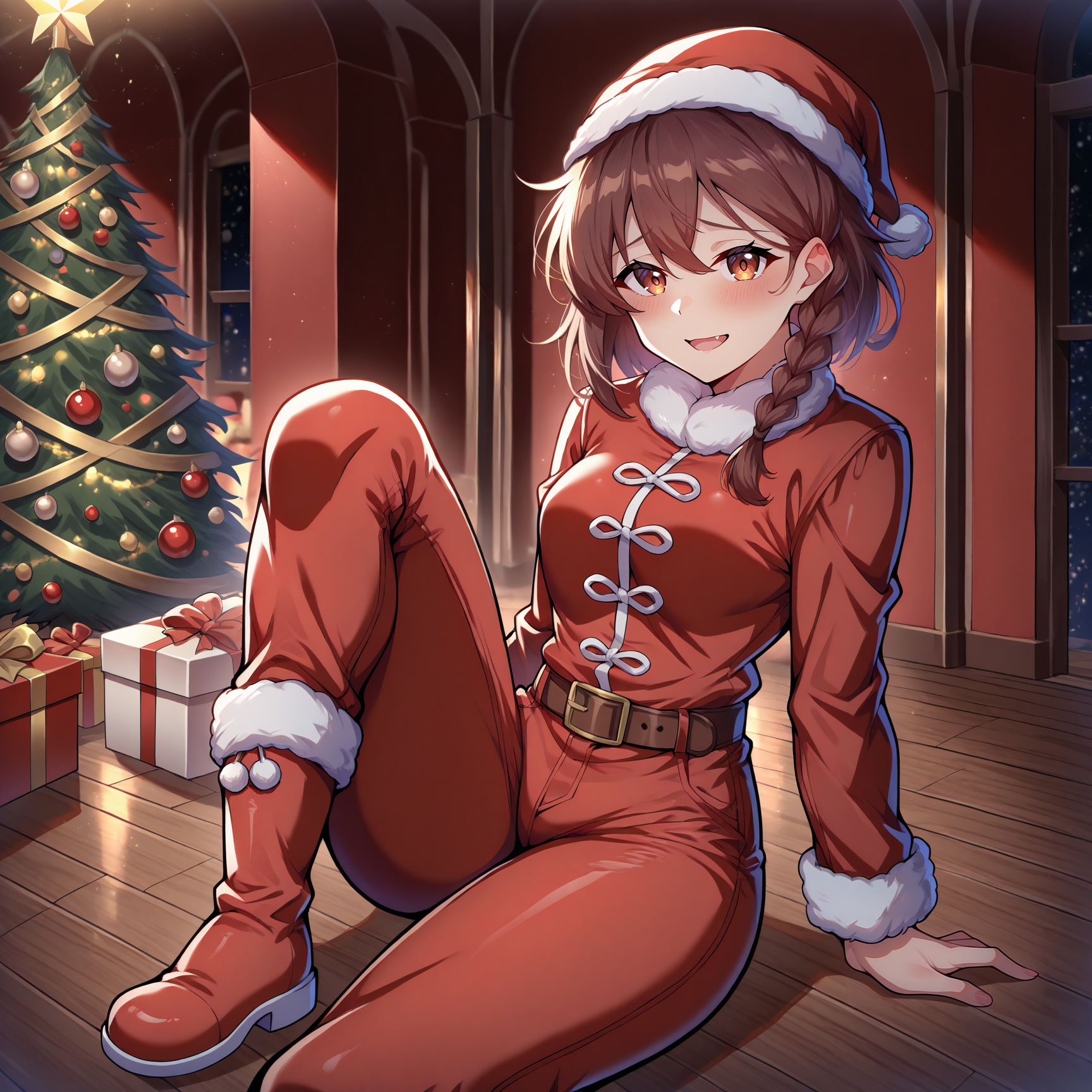 Outfit Prompts red shirt, red pants, red boots, white trim, fur trim red coat, brown belt, santa boots, santa hat