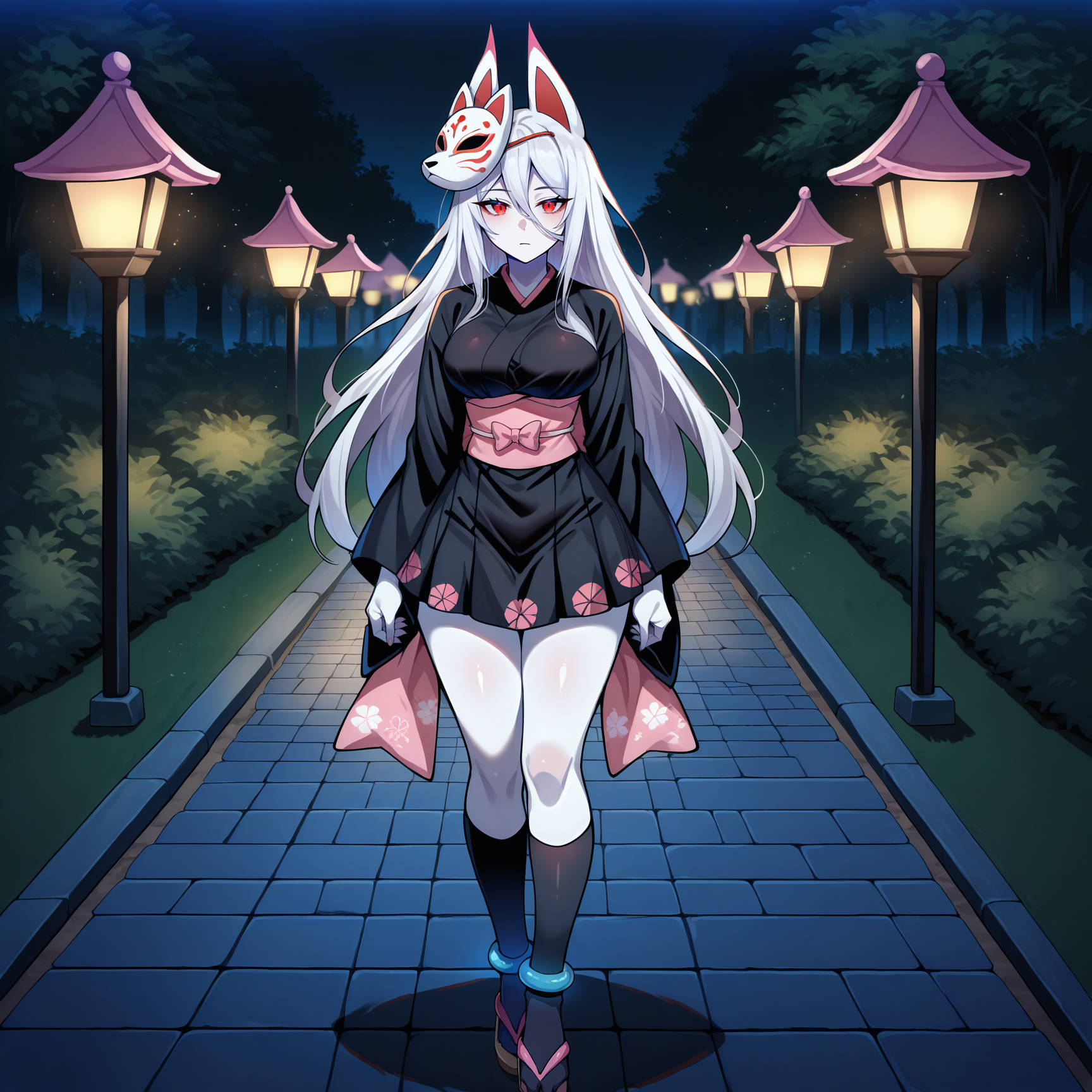 Outfit Prompts black kimono, pink floral print, pink belt bow, short kimono, black skirt, miniskirt, black kneehighs, torn clothes, mask on head, blue anklet
