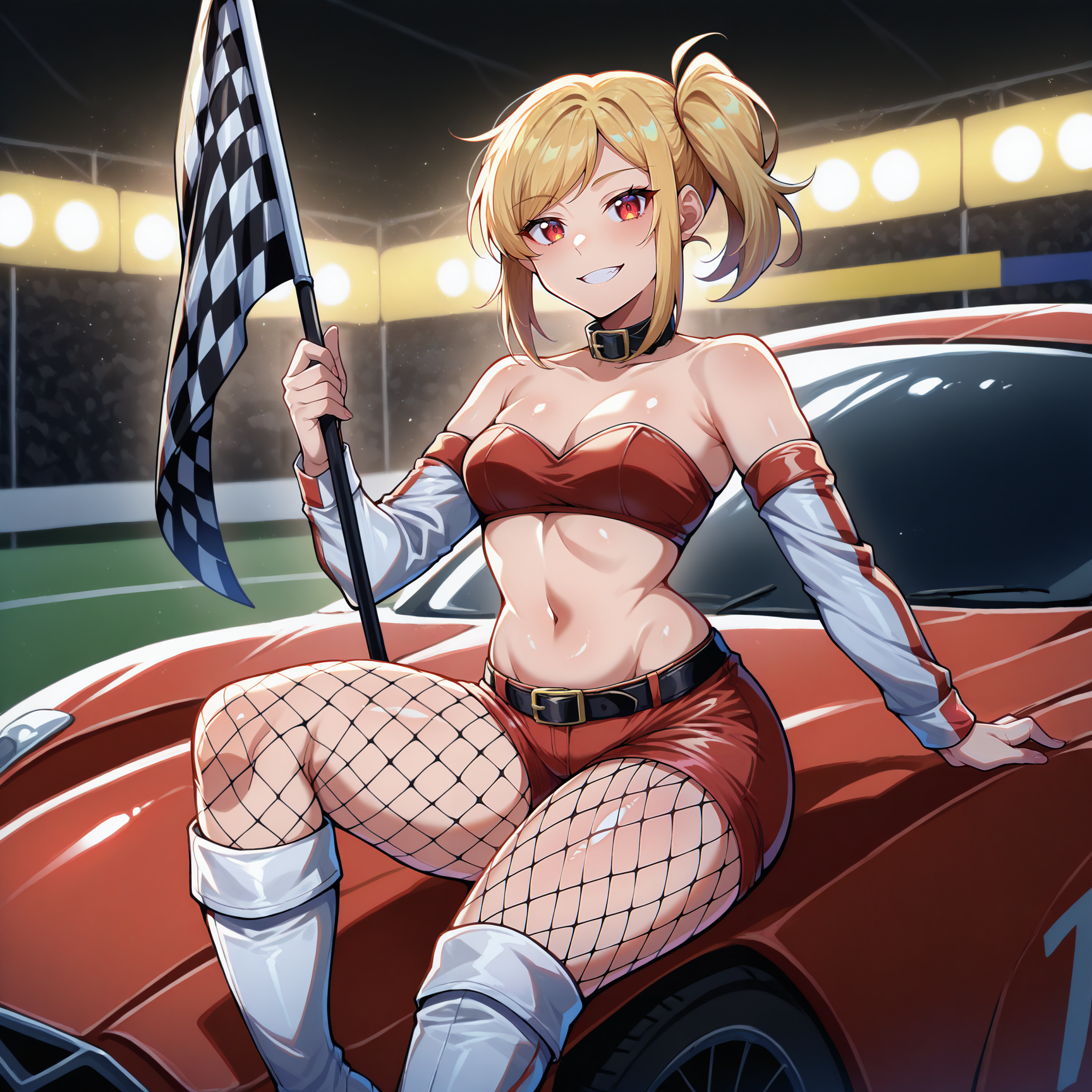 red bra, strapless bra, belt collar, white sleeves, long sleeves, detached sleeves, navel, red shorts, fishnet pantyhose, black garter belt, white boots, knee boots, race queen