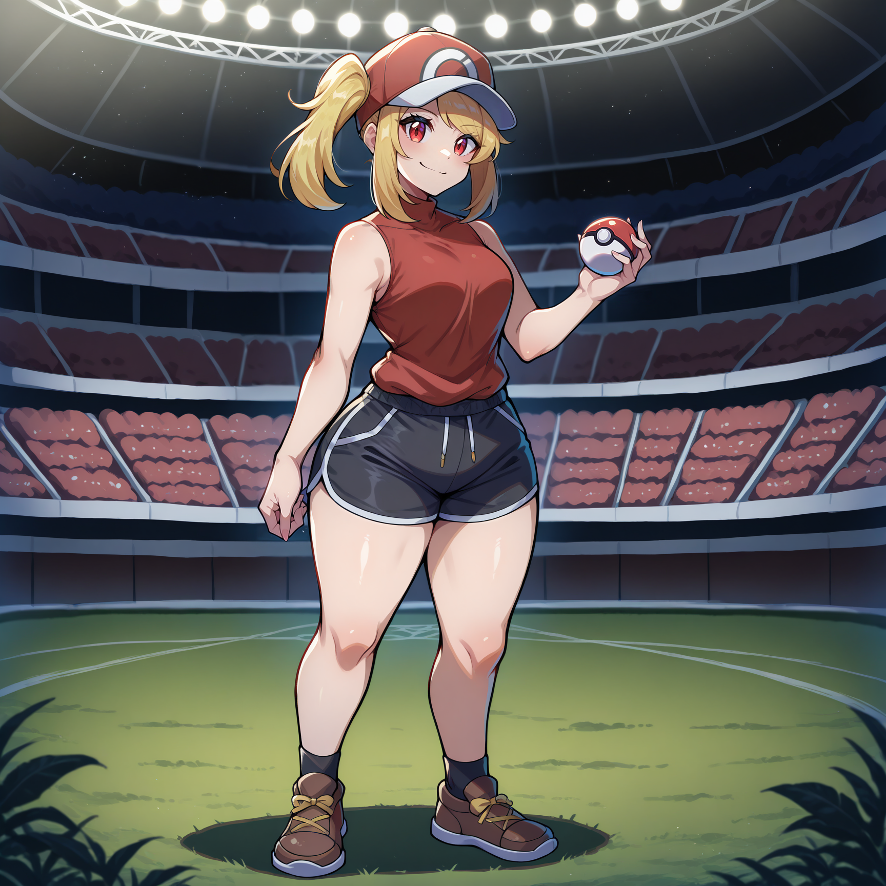 red shirt, sleeveless, black shorts, brown shoes, black socks, ankle socks, vampire, pokemon, baseball cap, red cap