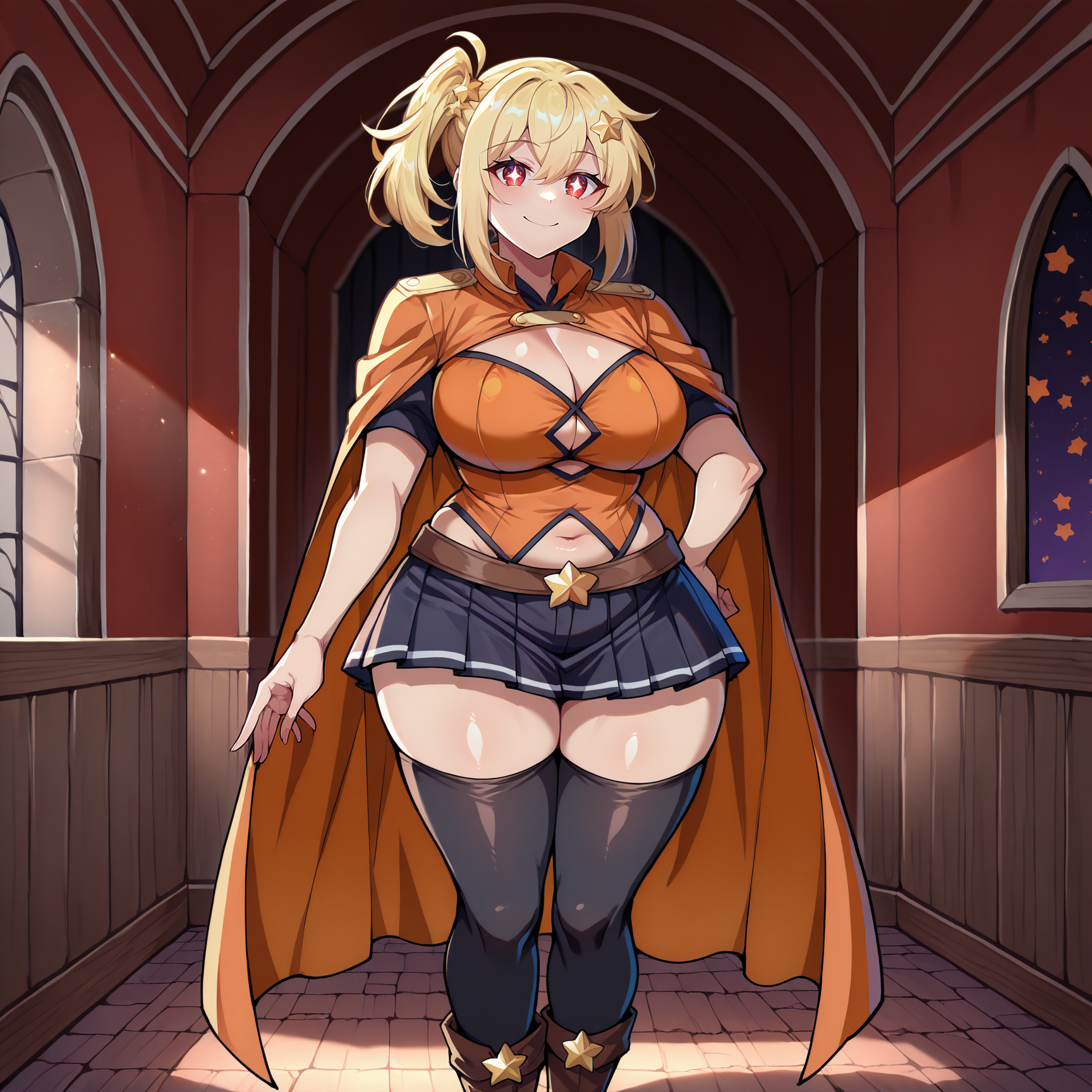 star hair ornament, hair tie, tied hair, grey epaulettes, orange cloak, orange shirt, brown belt, black thighhighs, brown boots, cleavage, black sleeves, short sleeves, navel, pleated skirt