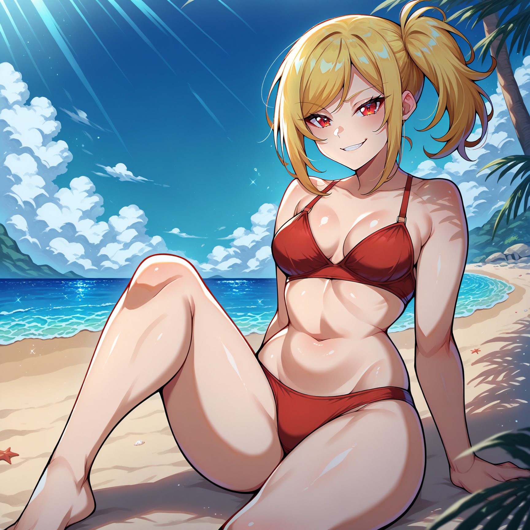 Physical Prompts 1girl, solo, gold hair, swept bangs, medium hair, sidelocks, side ponytail, red eyes