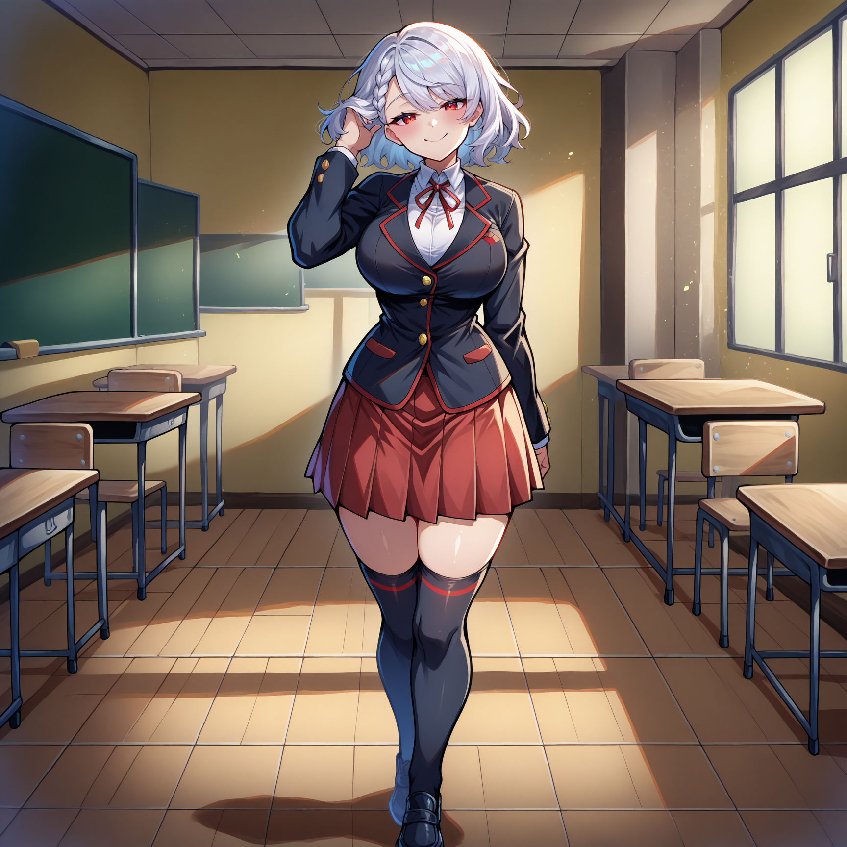 school uniform, white shirt, black jacket, closed jacket, red trim, red buttons, striped neck ribbon, red neck ribbon, black neck ribbon, collared shirt, red skirt, pleated skirt, black stripe, single stripe, horizontal-striped skirt, red stripe, horizontal-striped thighhighs, black thighighs, black shoes