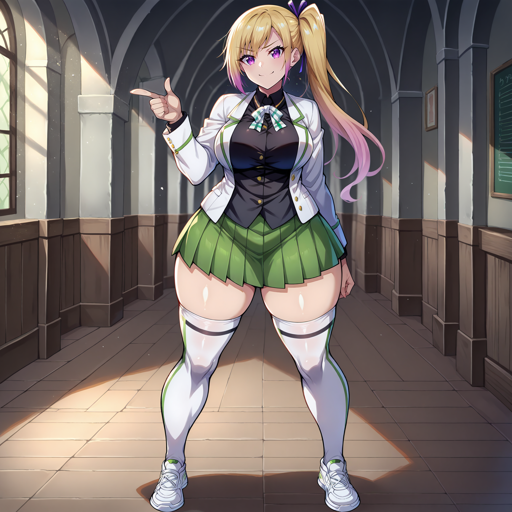 school uniform, black shirt, white jacket, closed jacket, green trim, green buttons, striped neck ribbon, green neck ribbon, white neck ribbon, collared shirt, green skirt, pleated skirt, white stripe, single stripe, horizontal-striped skirt, green stripe, horizontal-striped thighhighs, white thighighs, white shoes