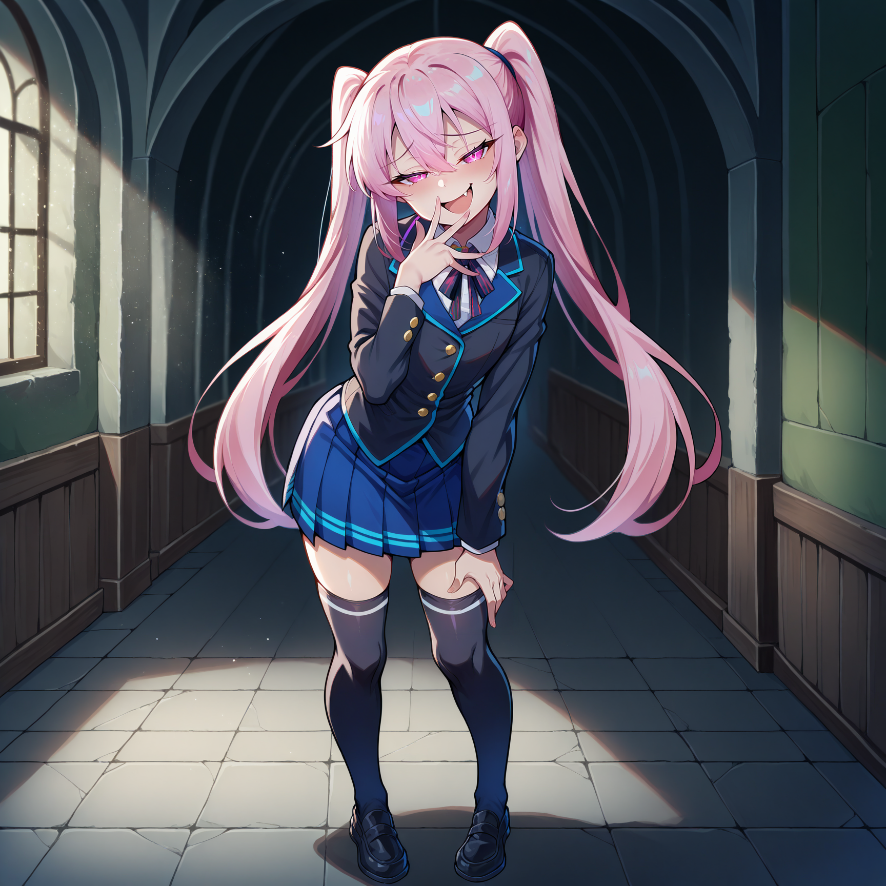 1girl, solo, pink hair, twintails, long hair, black tie, hair tie, tied hair, hair between eyes, sidelocks, pink eyes, vampire