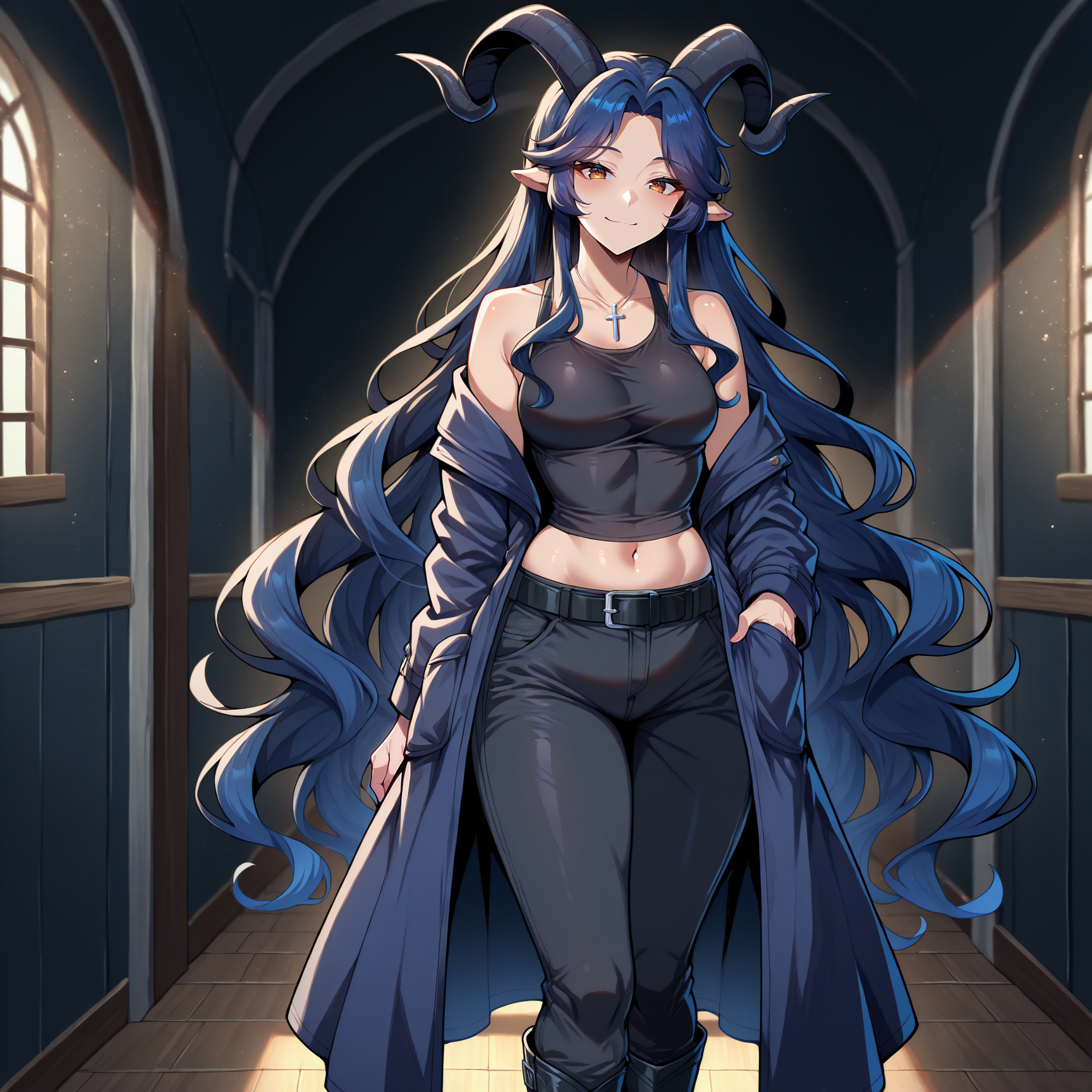 black tanktop, collared tanktop, navel, bare shoulders, dark blue coat, black pants, black belt, black boots, silver pendant, cross pendant