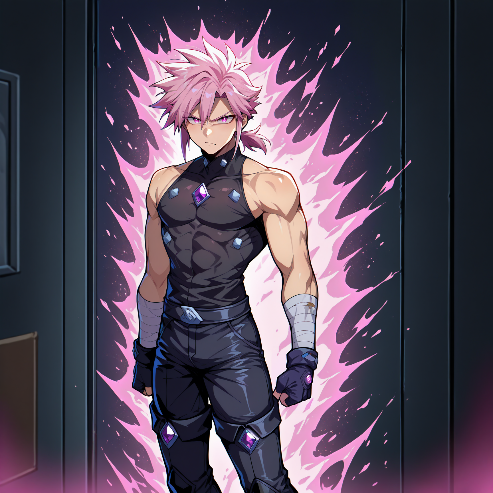 Physical Prompts 1boy, solo, <lora:male_solo_focus-000009:1>, male focus, pink hair, hair between eyes, parted bangs, sidelocks, medium hair, (spiked hair:1.3), short ponytail, low ponytail, muscular, pink eyes