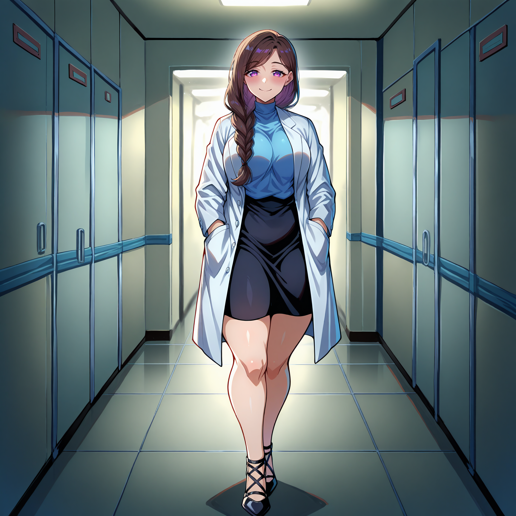 Outfit Prompts white coat, doctor, blue blouse, black skirt, short skirt, black high heels, lace-up heels