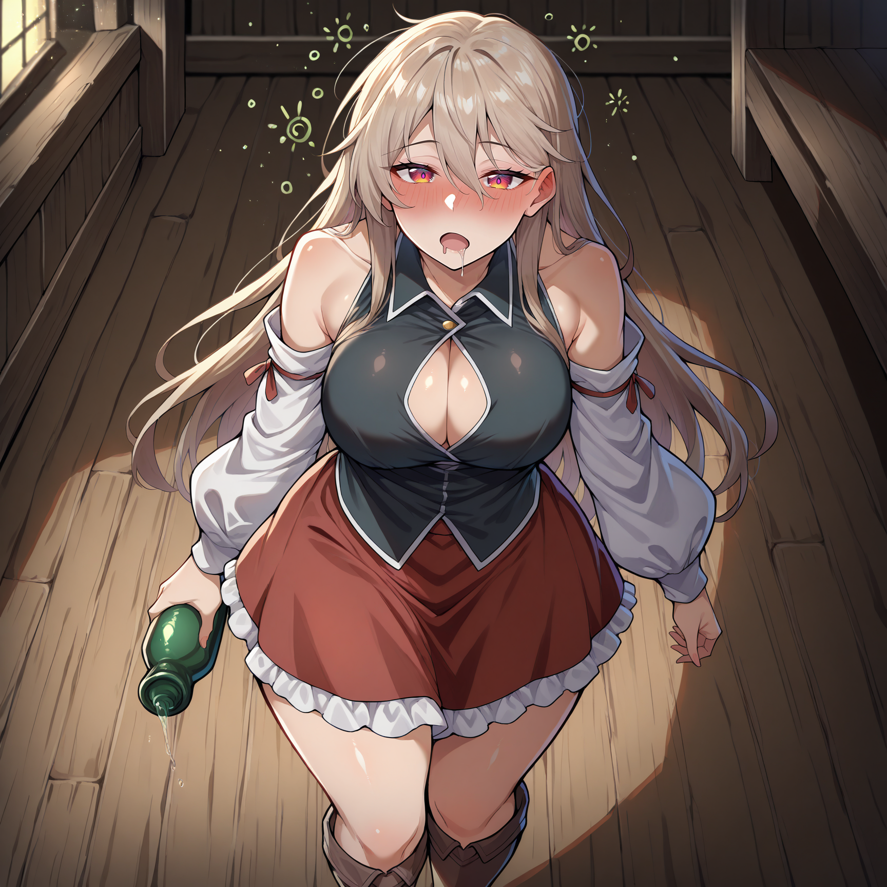 black shirt, collared shirt, white cleavage, bare shoulders, detached sleeves, white sleeves, long sleeves, red skirt, white frills, frilled skirt,brown boots, knee boots
