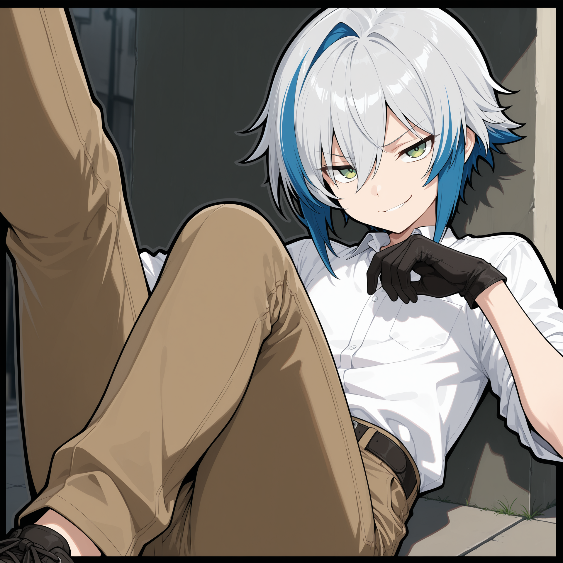 white shirt, black gloves, brown pants,