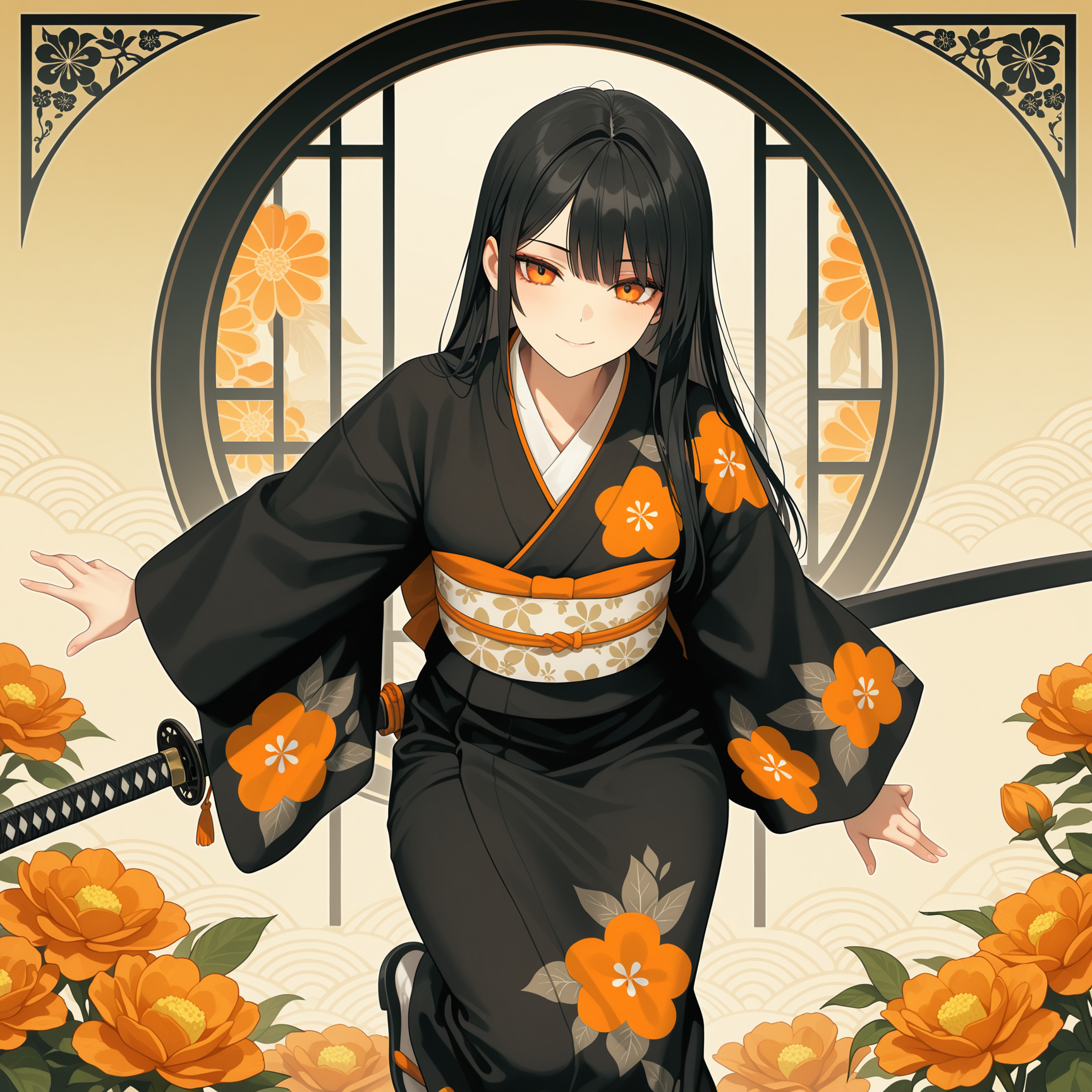 female face, 1girl, adult face, black hair, long hair, orange eyes