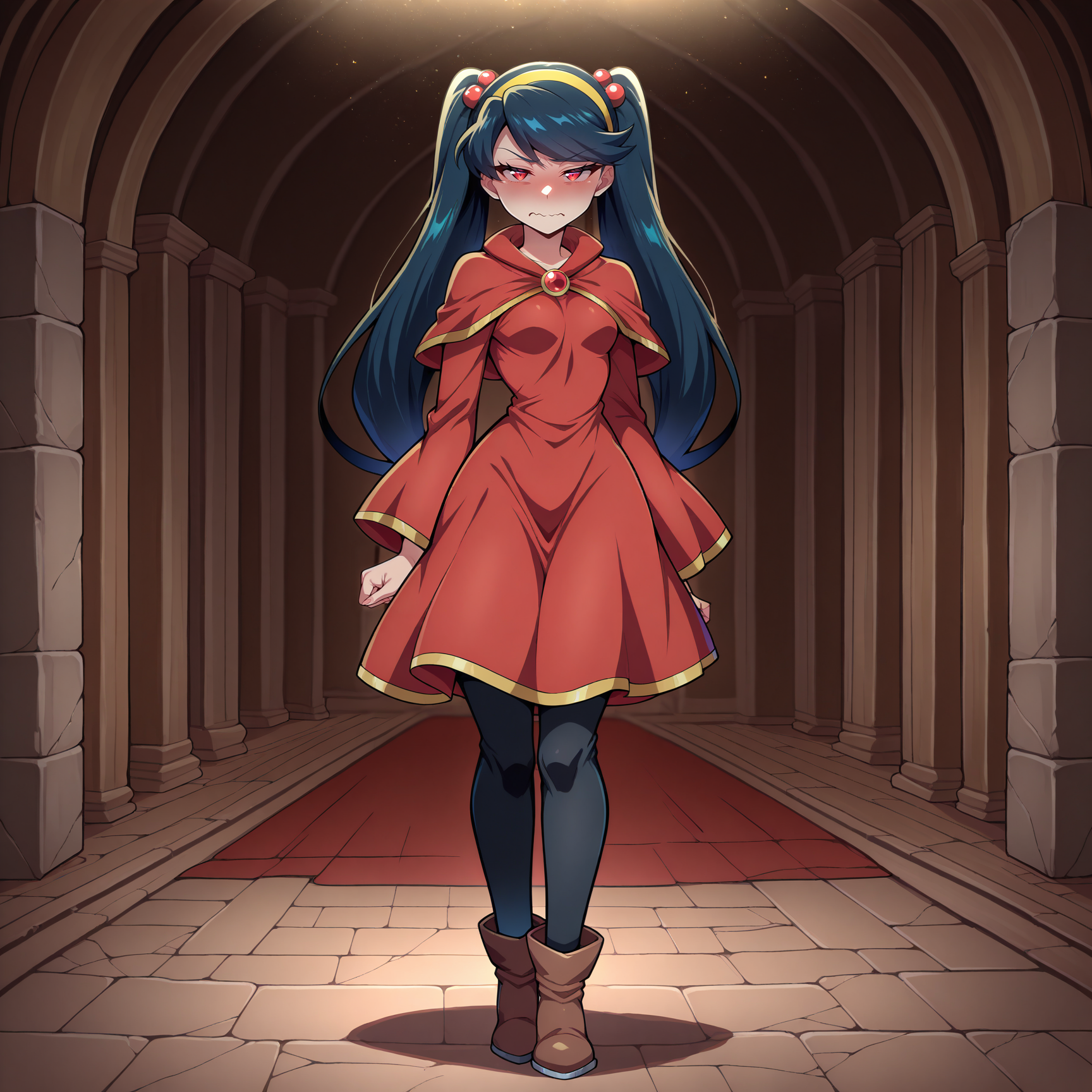 Outfit Prompts yellow hairband, hair bobbles, red bobbles, red dress, red capelet, gold trim, wide sleeves, black pants, pants under dress, brown boots, ankle boots