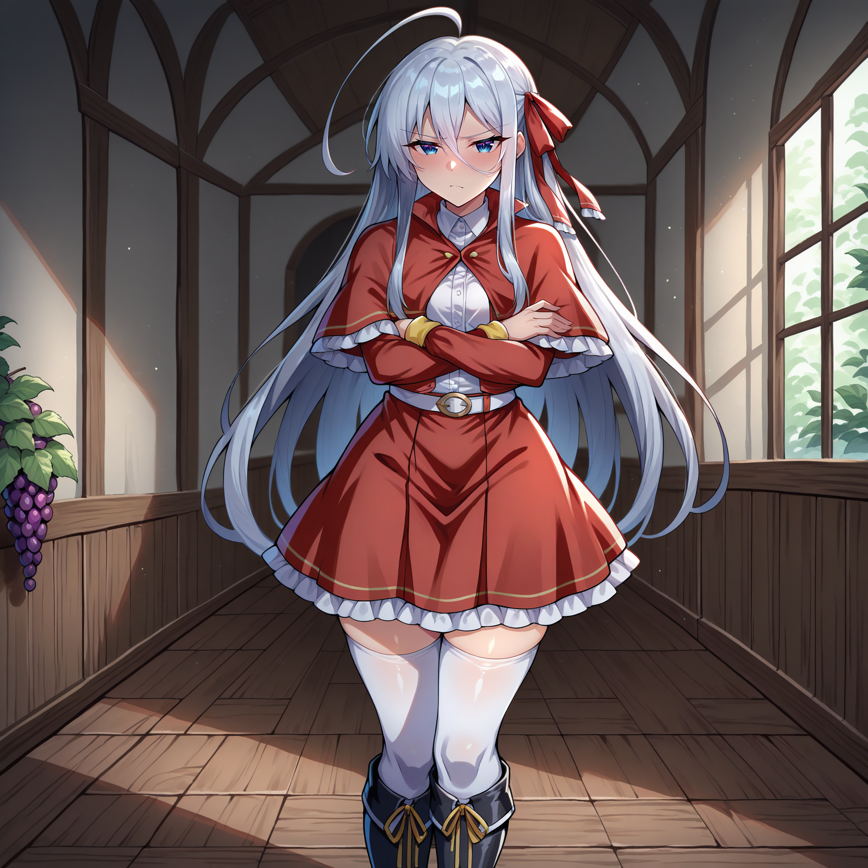 1girl, solo, silver hair, hair between eyes, long hair, long sidelocks, straight hair, huge ahoge, dark blue eyes, red ribbon, hair ribbon