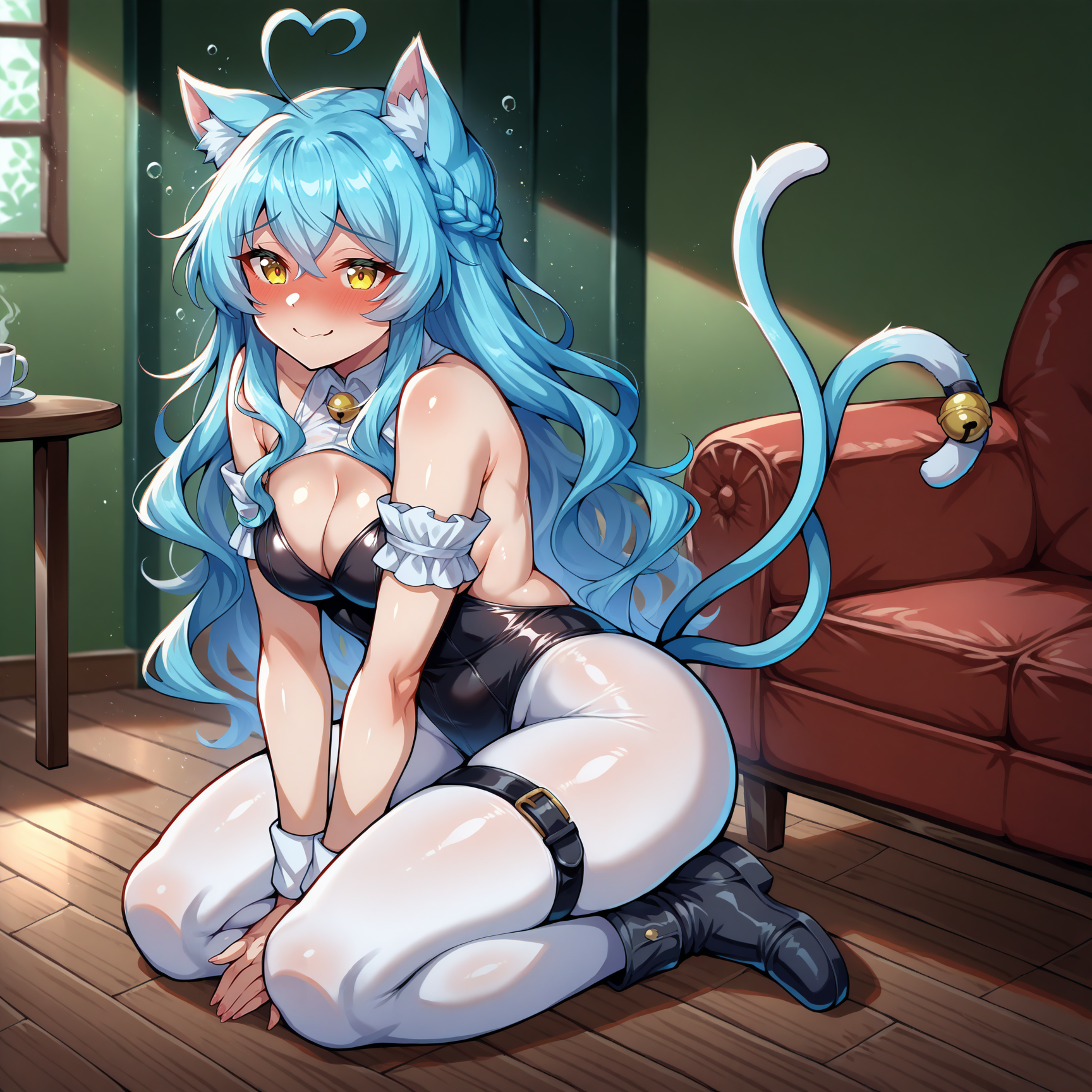 1girl, solo, light blue hair, hair between eyes, long sidelocks, wavy hair, long hair, crown braid, cat girl, cat ears, cat tail, two tails, nekomata, heart ahoge, yellow eyes