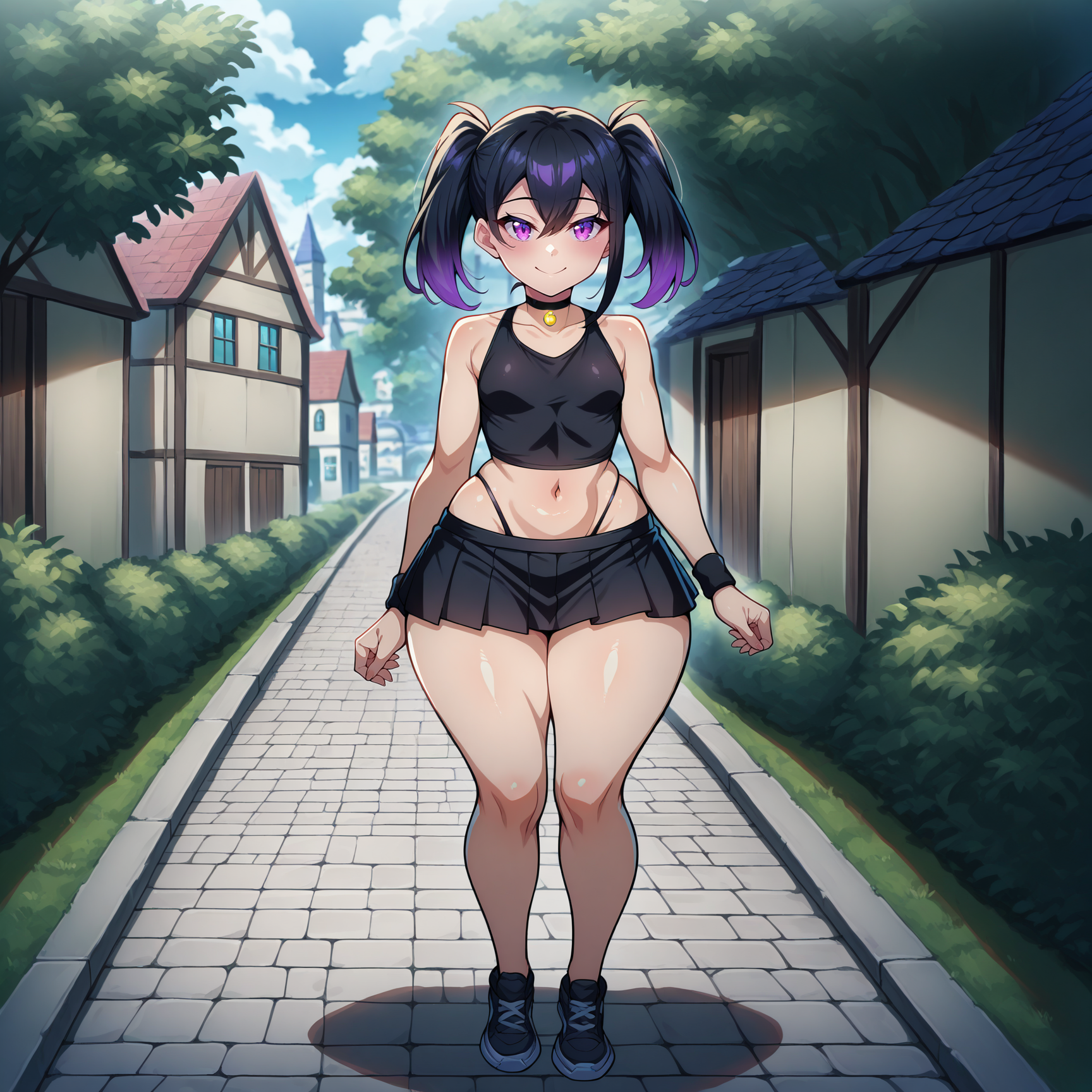 1girl, solo, black hair, twintails, hair between eyes, single sidelock, purple eyes