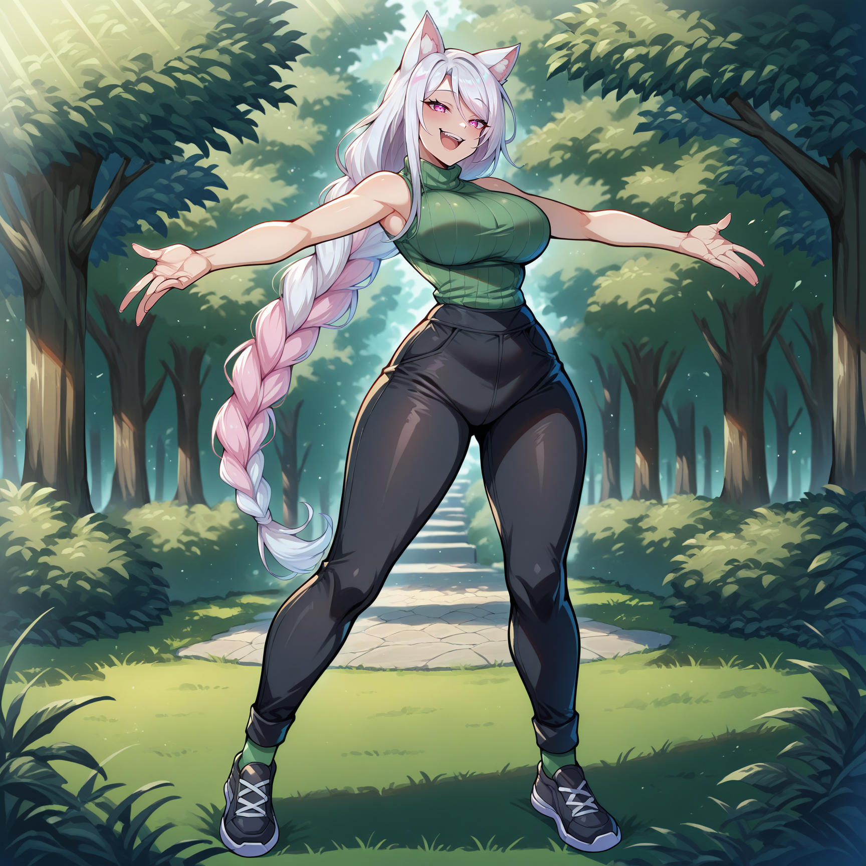 cat girl, green sweater, turtleneck, sleeveless, black pants, green socks, black shoes