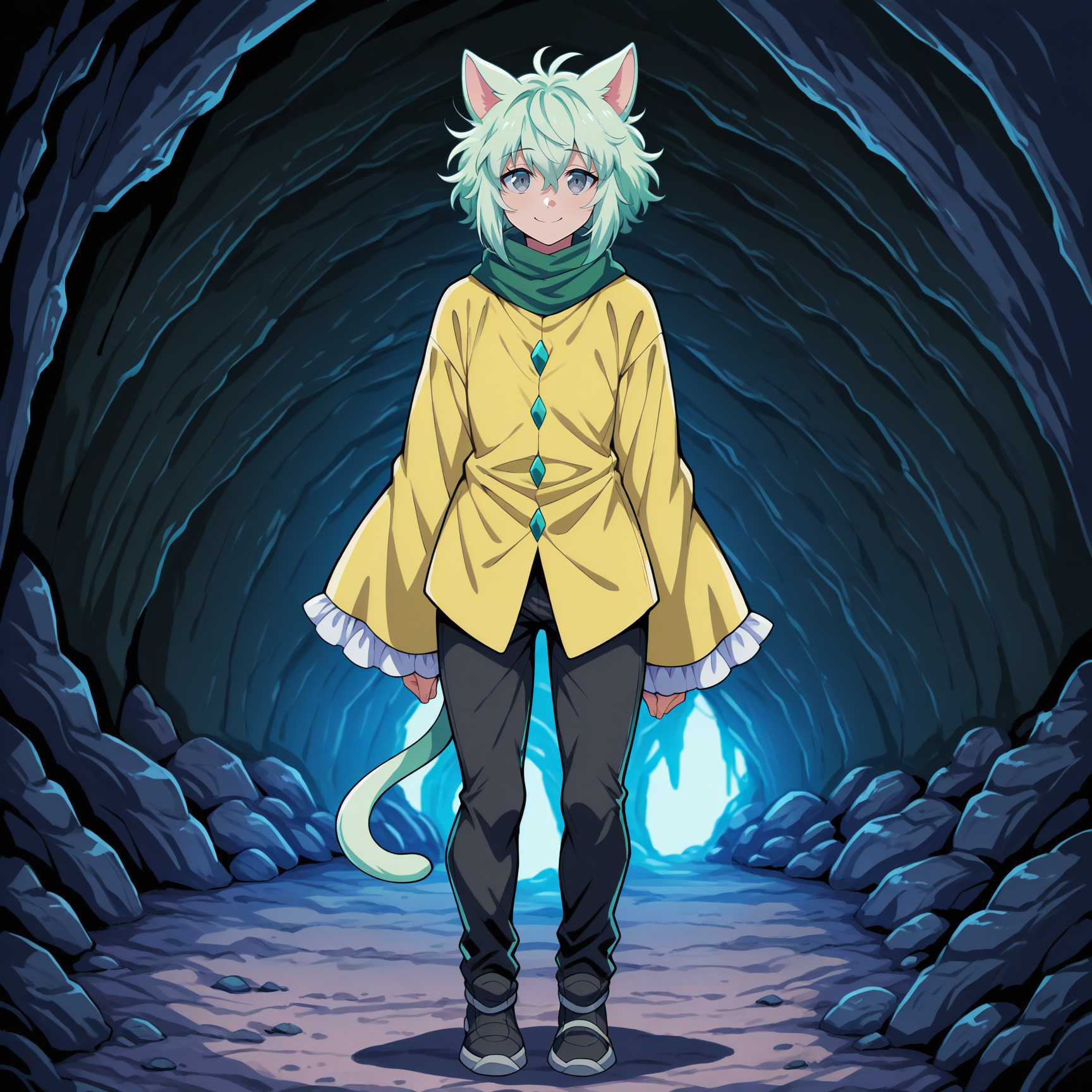 yellow jacket, green shirt, diamond button, frilled sleeves, wide sleeves, green scarf, black pants, black shoes