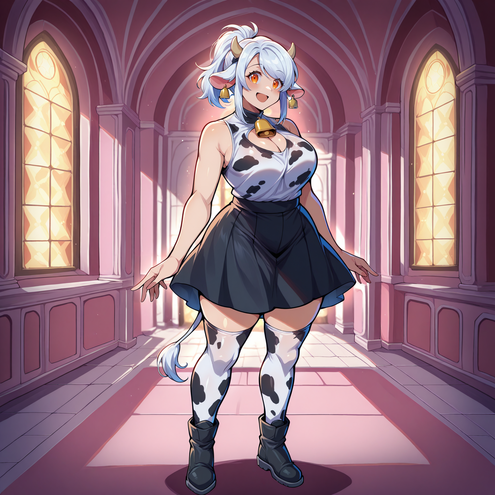 cow print thighhighs, cow print shirt, black skirt, sleeveless, cleavage, ear bell, black boots, ankle boots