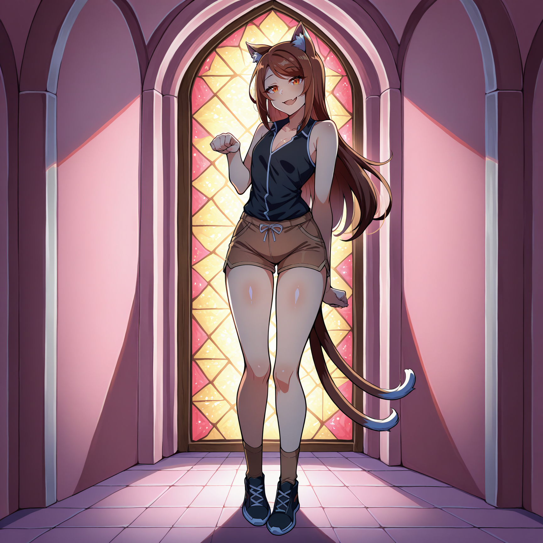 1girl, solo, brown hair, cat girl, cat ears, cat tail, two tails, nekomata, swept bangs, long hair, long sidelocks, orange eyes