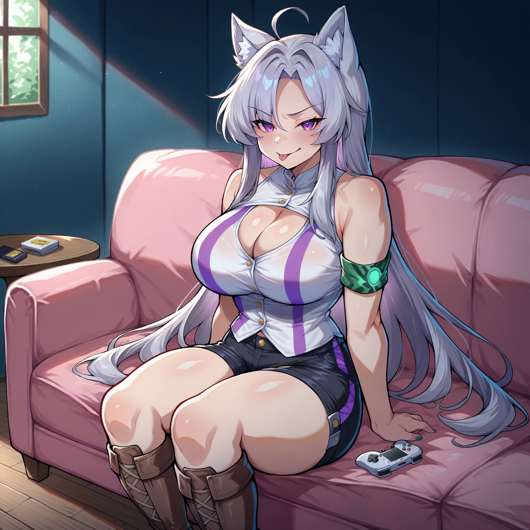 1girl, solo, light grey hair, parted bangs, asymmetrical bangs, hair intakes, disheveled, long hair, long sidelocks, ahoge, black nails, wolf girl, wolf ears, purple eyes