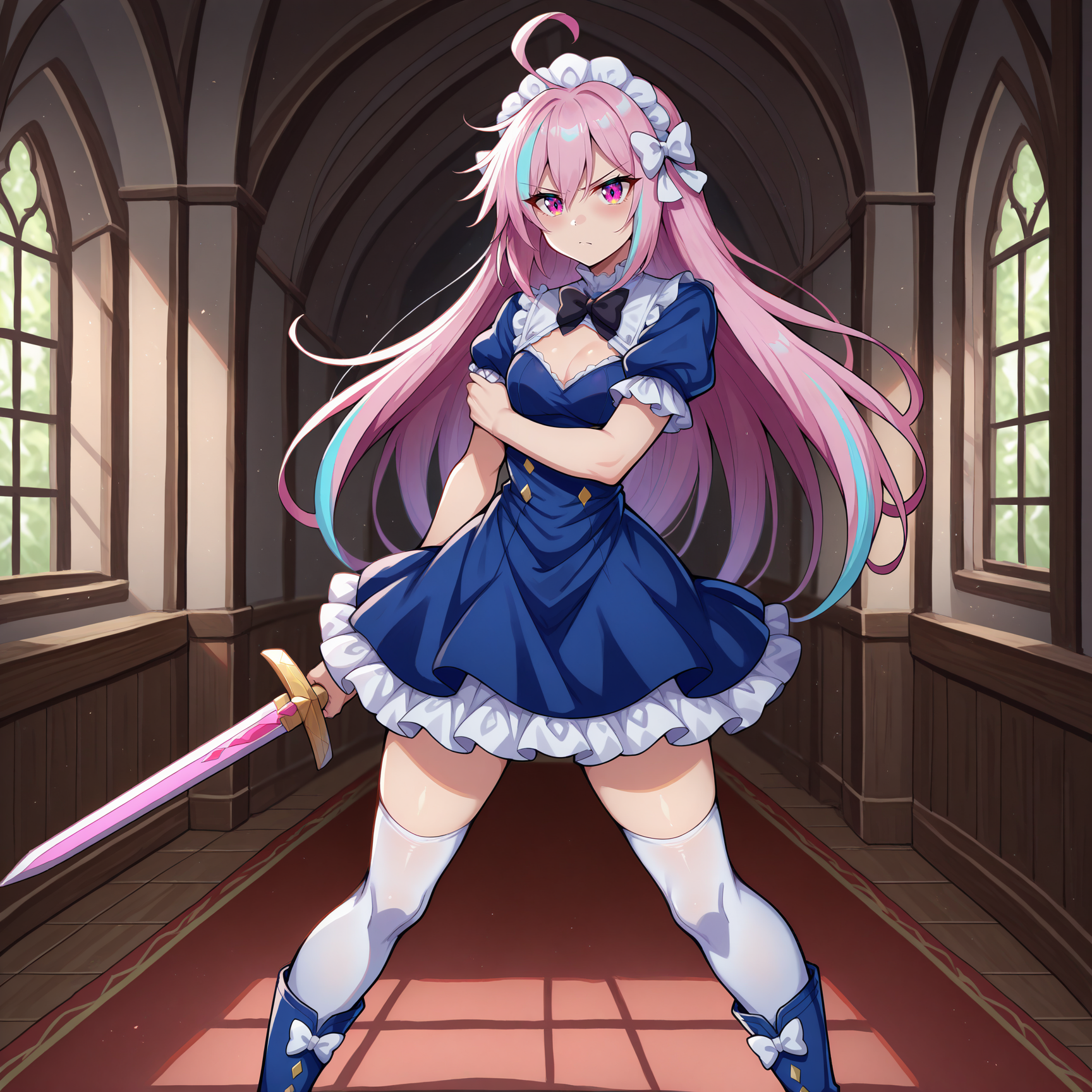 1girl, solo, pink hair, long hair, disheveled, hair between eyes, straight hair, crown braid, ahoge, light blue streaks, streaked hair, magenta eyes