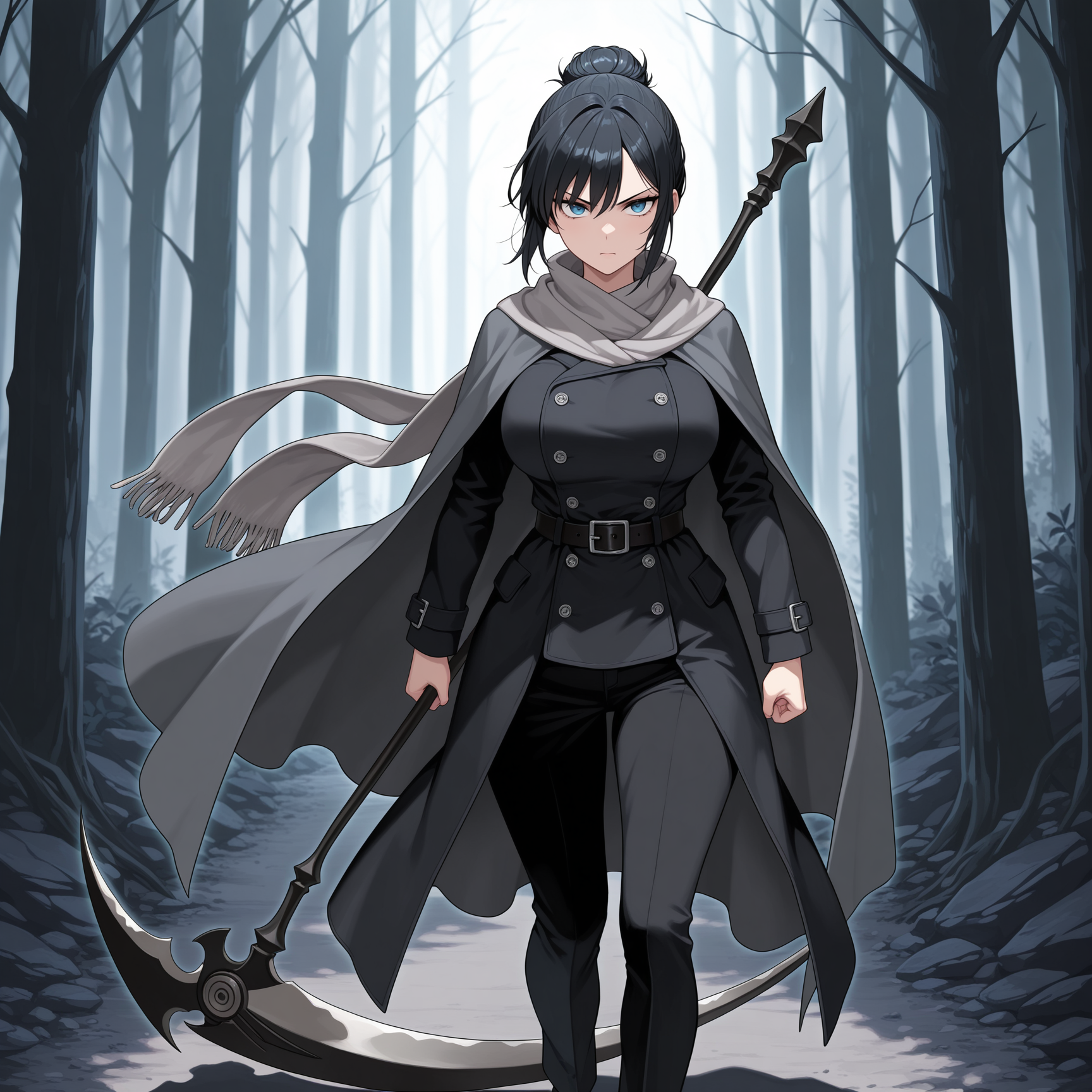 gray cape scarf, black coat, belt, black pants, black scythe on back,