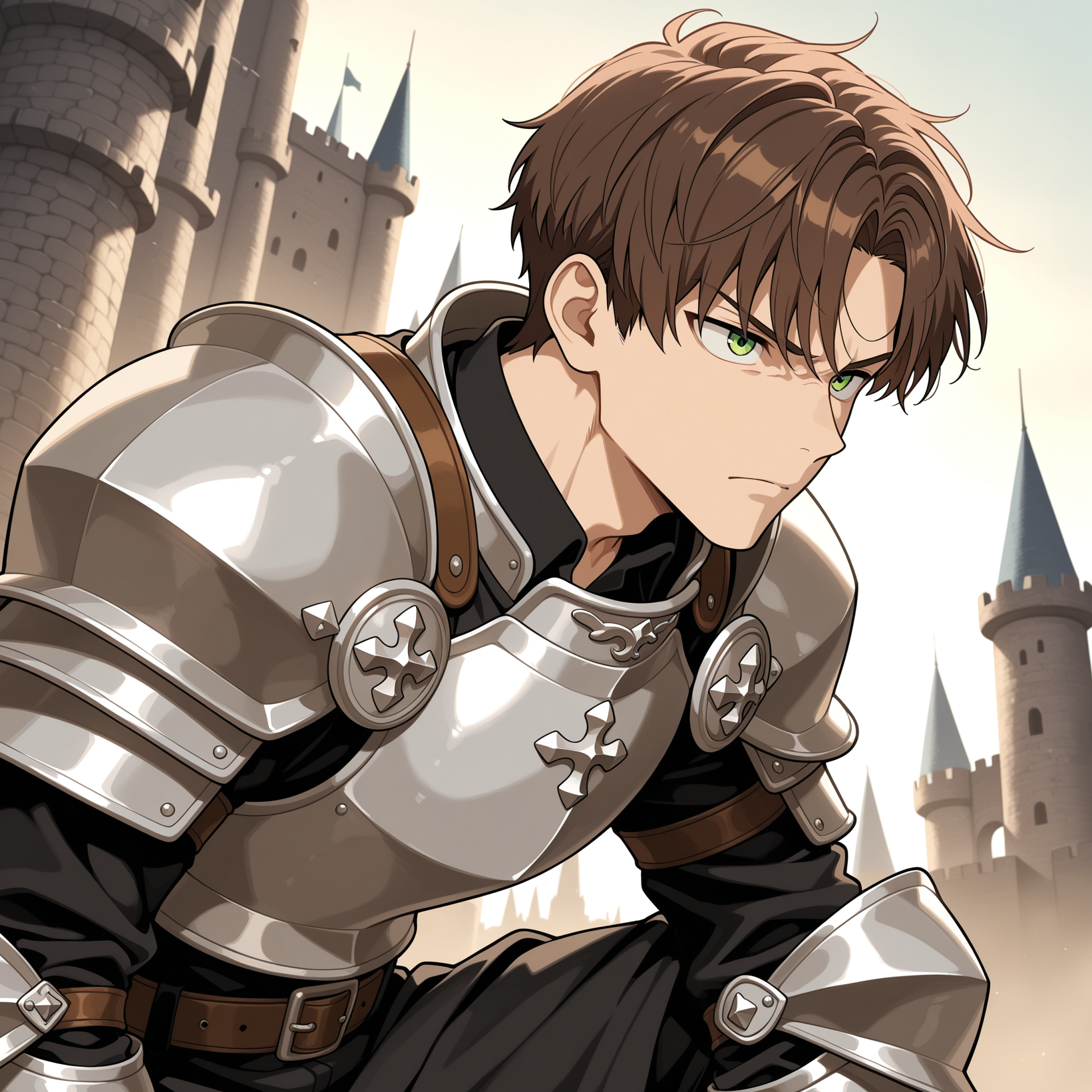 1boy, adult face, brown hair, short hair, green eyes, serious,