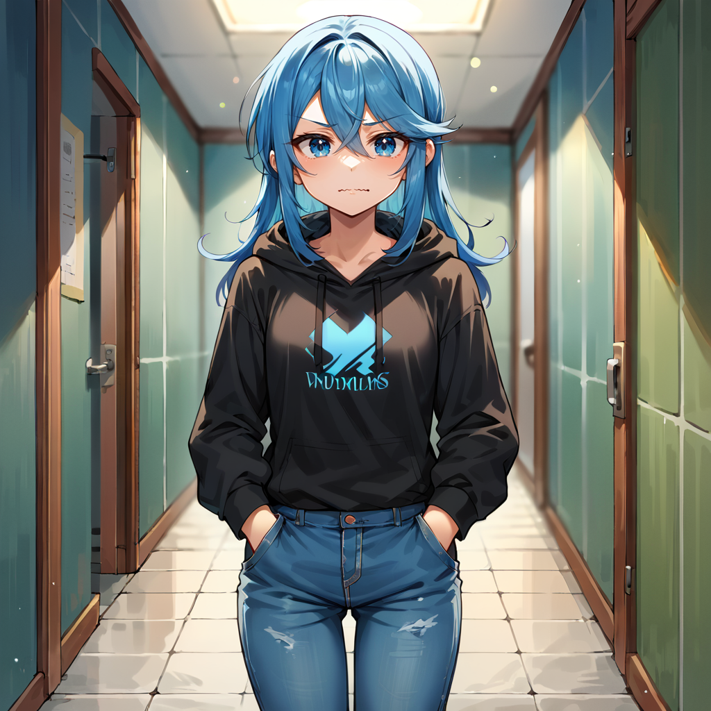 Dyed blue hair, long hair, blue eyes, swept bangs