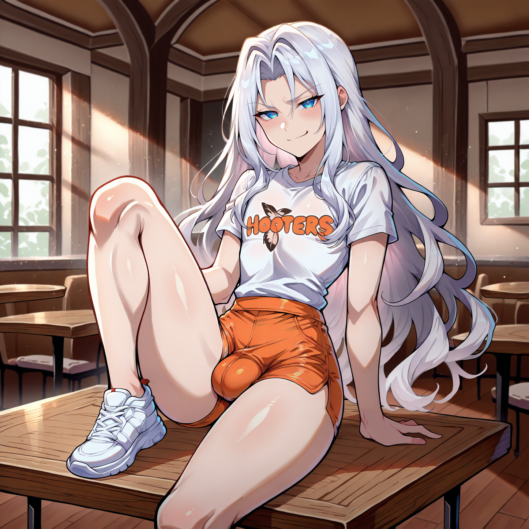 hooters, femboy hooter, white shirt, orange shorts, short shorts, white shoes