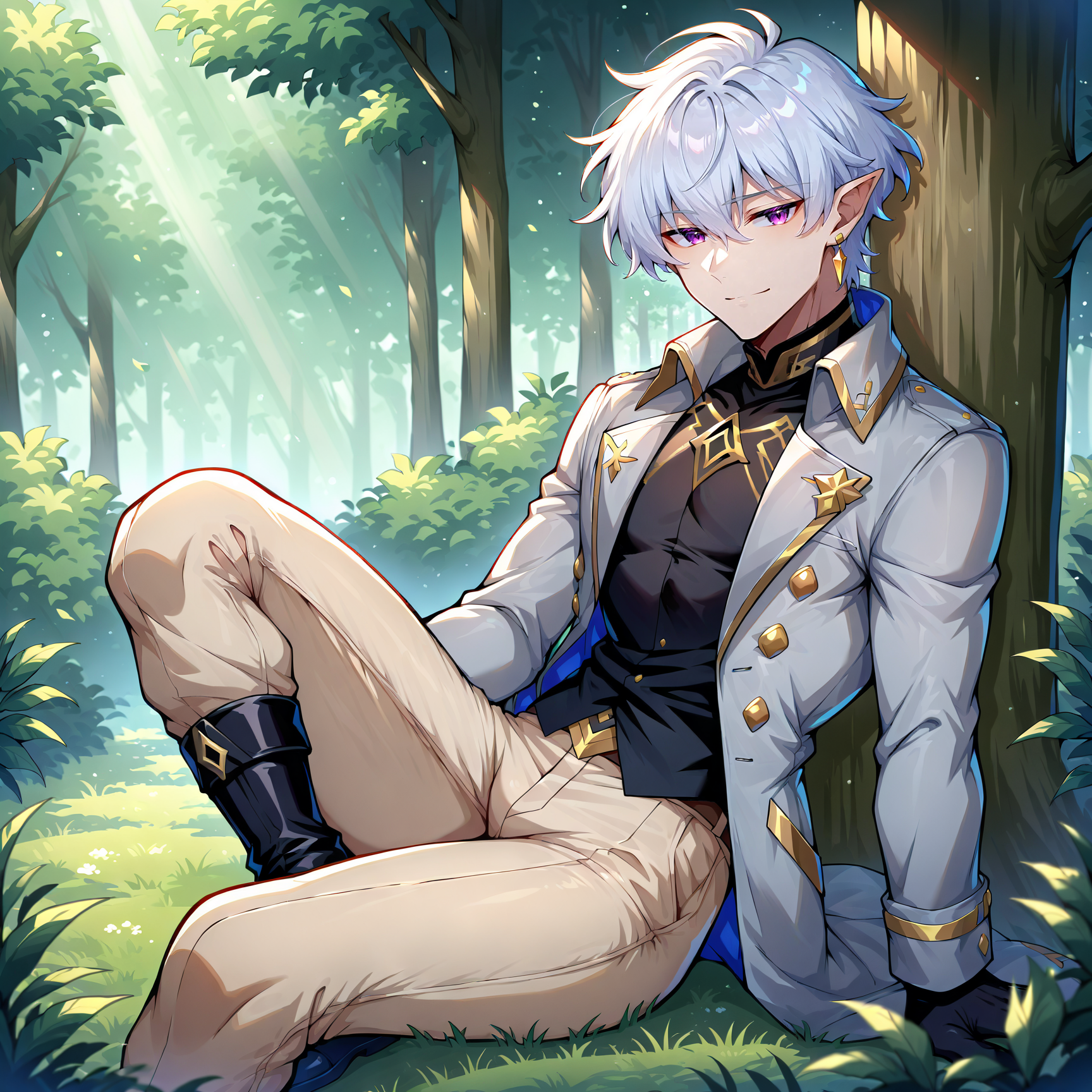 1boy, solo,male focus, white hair, short hair, pale skin, pink eyes, sinewy, pointy ears