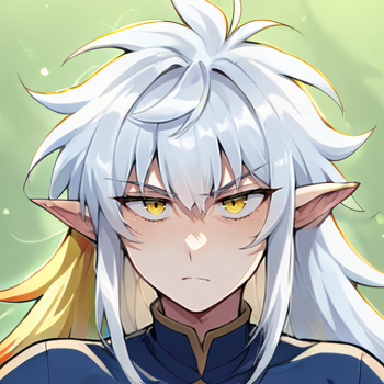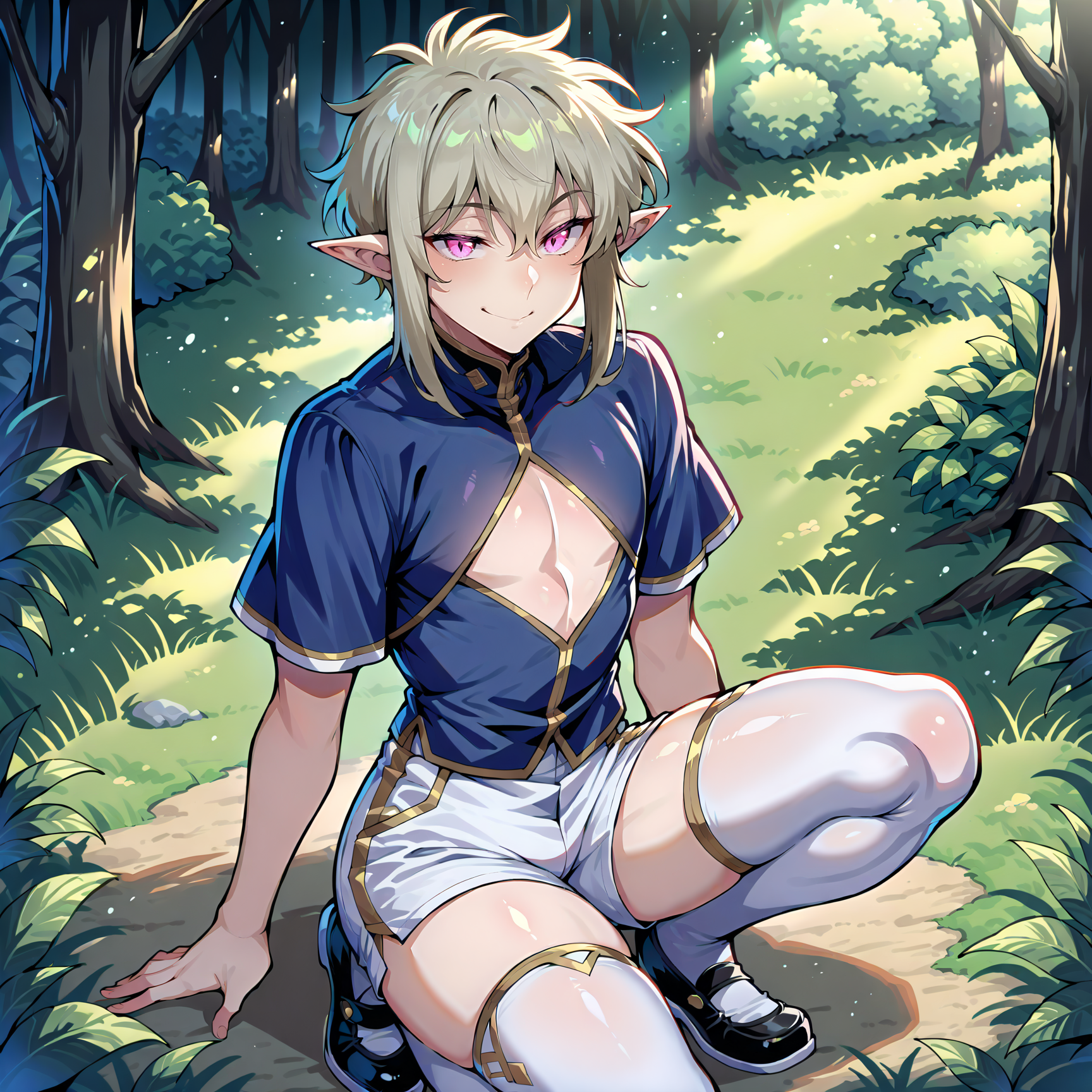 dark blue shirt, small cleavage cutout, gold trim, white trim, pointy ears, white thighhighs, white shorts,black footwear