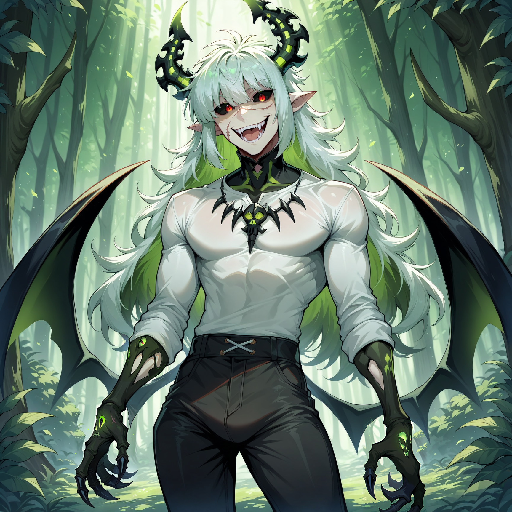 1boy, solo, male focus, (dead master:0.8), (white hair:1.3), dark green streaks, messy hairs, spiked hair, long hair, , pale skin, red eyes, black sclera, slit pupils, pointy ears, skeletal horns, skeletal tail, skeletal claws, fangs, scar on face