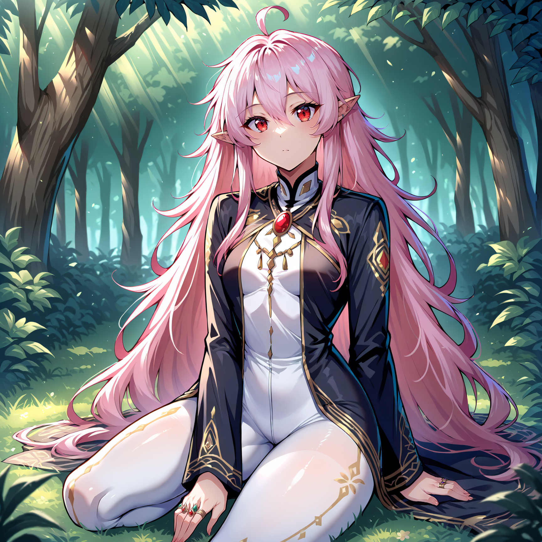 1girl, female focus, solo, pink hair, very long hair, messy hair, crimson eyes, pointy ears, ahoge