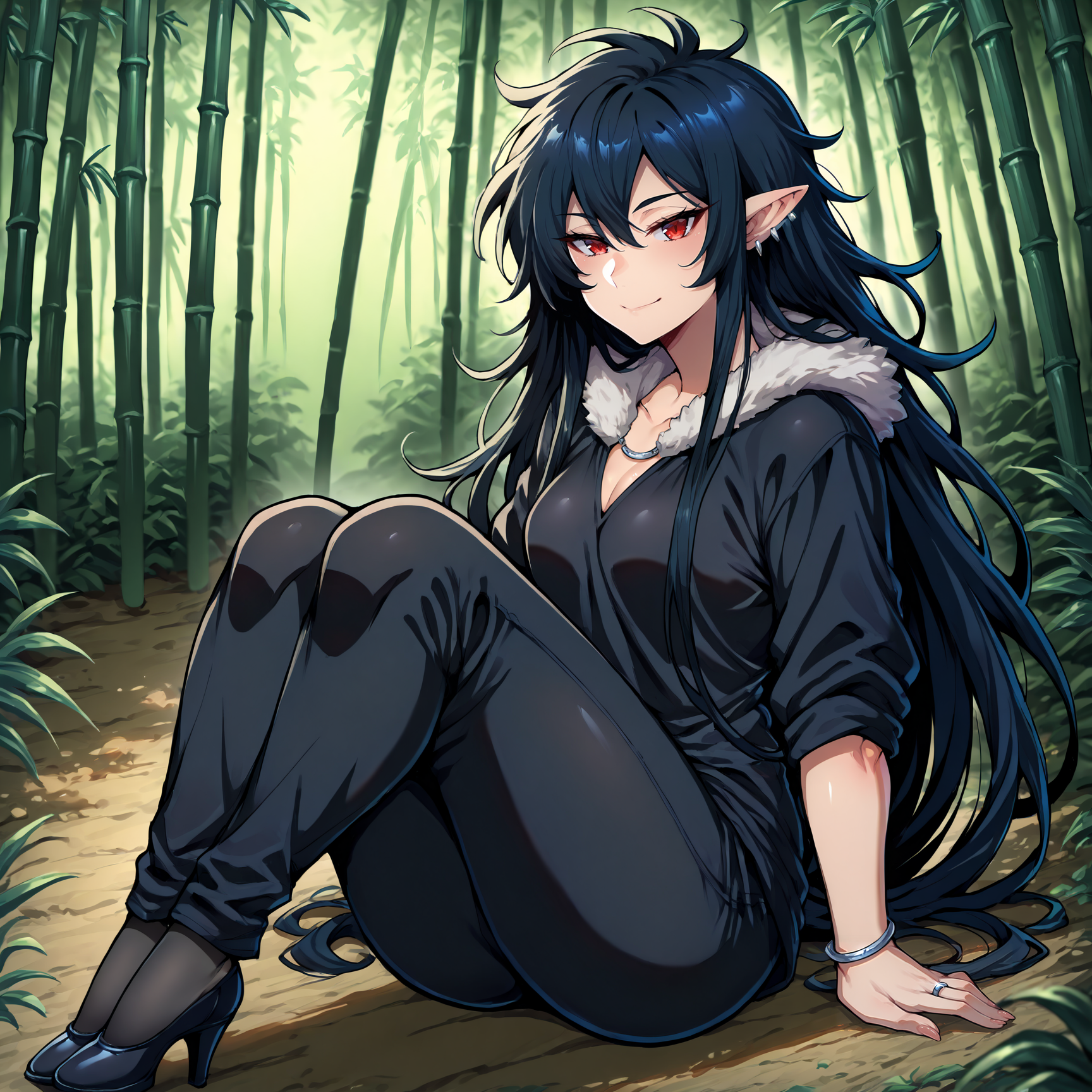 black shirt, v-neck, black short kimono, (black fur:1.5), (fur hood:1.3), fur trimmed hood, (hood down:1.4), black pants, black footwear, silver bracelet, silver earrings, silver ring, silver necklace,multiple earrings, black heels
