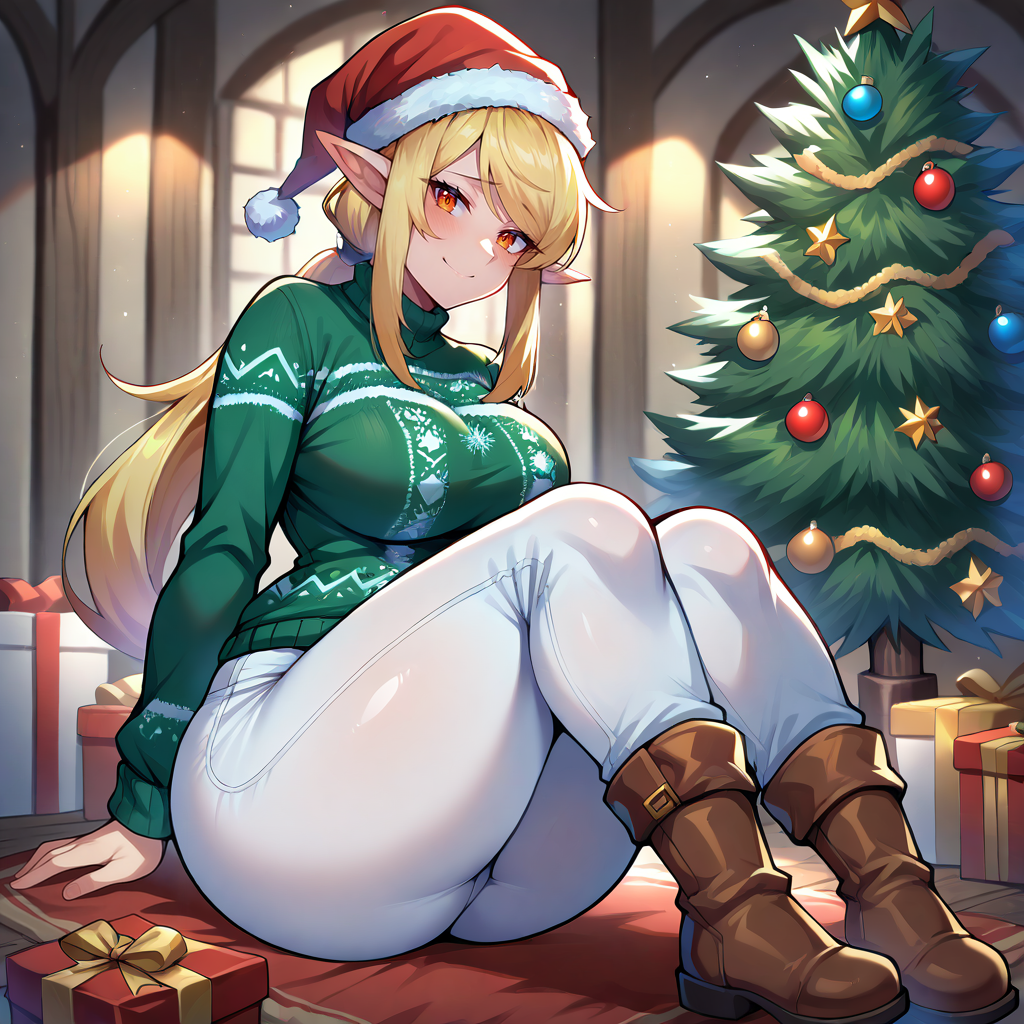 Outfit Prompts santa hat, christmas stocking, white trim, fur trim,, green sweater, white pants, brown boots