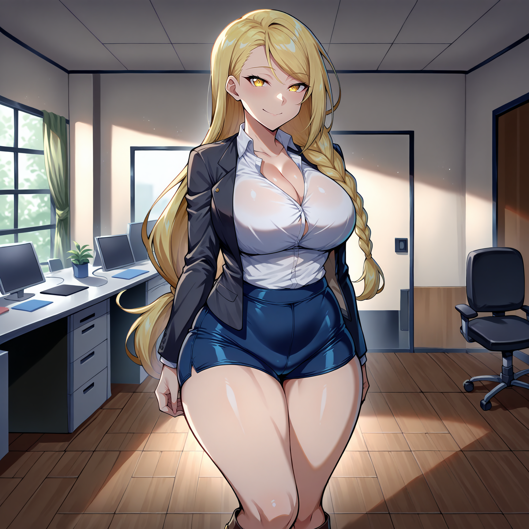 white shirt, collared shirt, cleavage, black jacket, open jacket, dark blue shorts, bike shorts, office skirt, dark brown boots