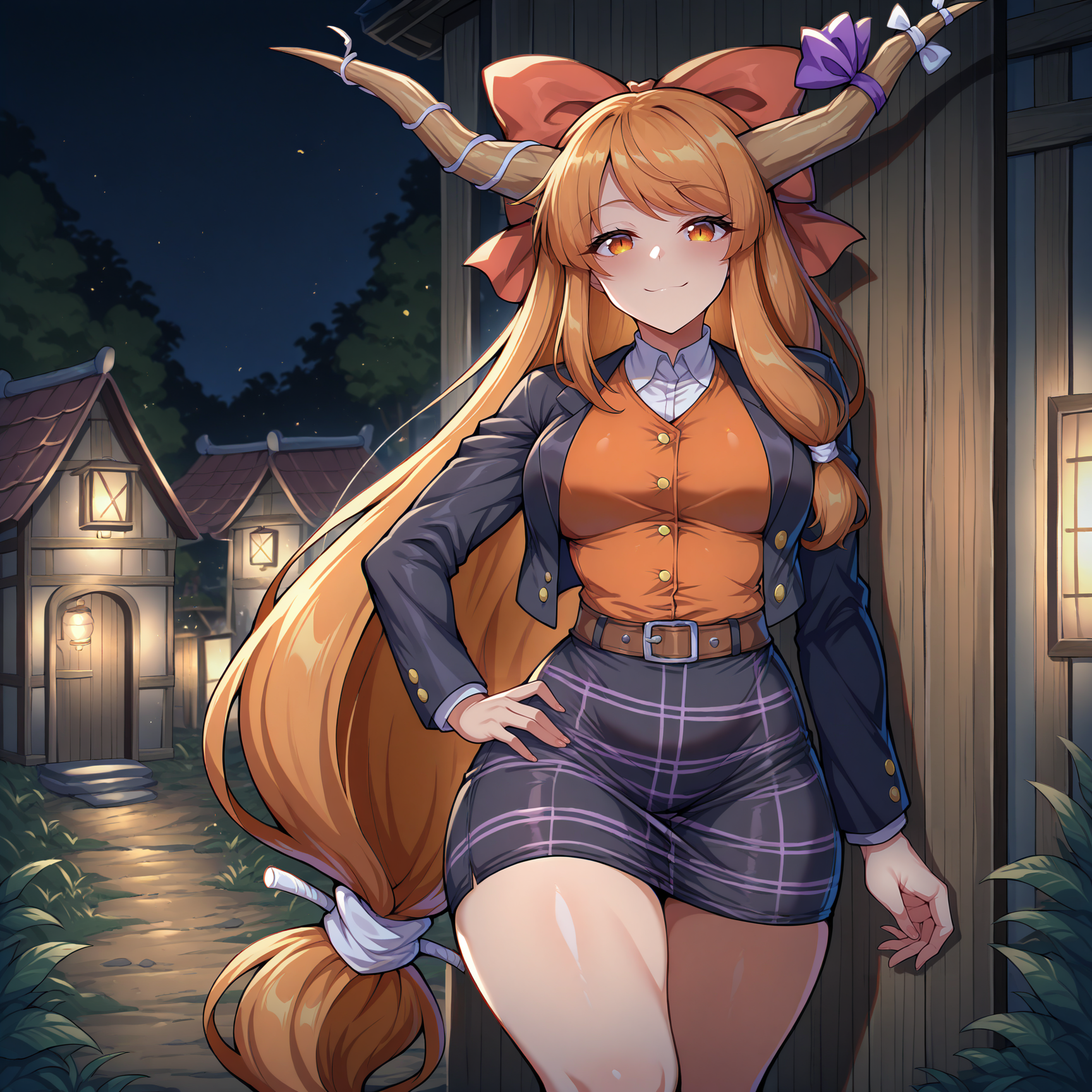 1girl, solo, ibuki suika, orange hair, swept bangs, sidelocks, very long hair, low tied hair, low ponytail, oni horns, long horns, wooden horns, amber eyes