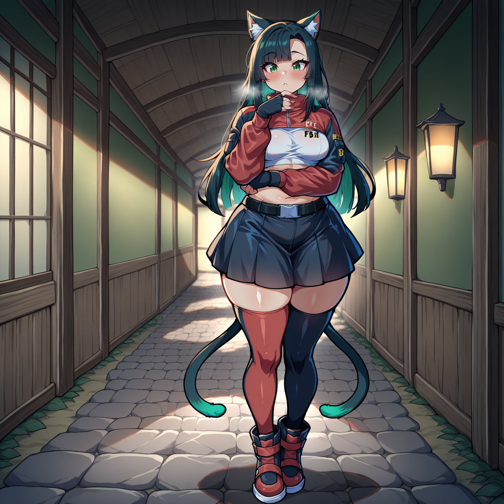 white crop top, black jacket, red jacket, winter clothes, puffy sleeves, black gloves, fingerless gloves, black belt, black skirt, zettai ryouiki, black thighhighs, red thighhighs, two-tone thighhighs, two-tone jacket, black boots, red boots, two-tone footwear, fbi