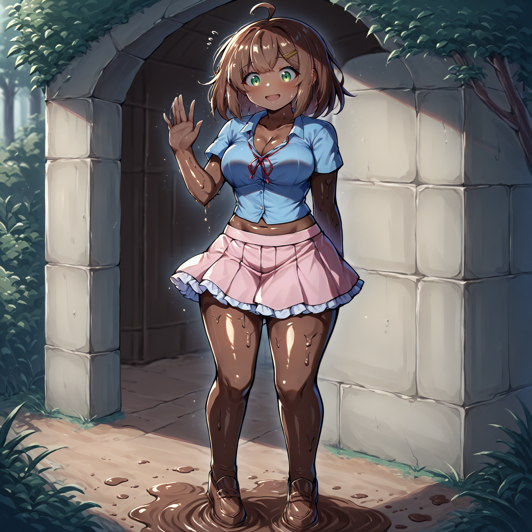 Physical Prompts 1girl, solo, green eyes, brown hair, hairclip, medium hair, bangs, ahoge, <lora:chocolate_tf_v2:0.8>, chocolate tf, chocolate clothes, chocolate hair, brown skin, chocolate eyes, transformation, chocolate statue, petrification, chocolate girl