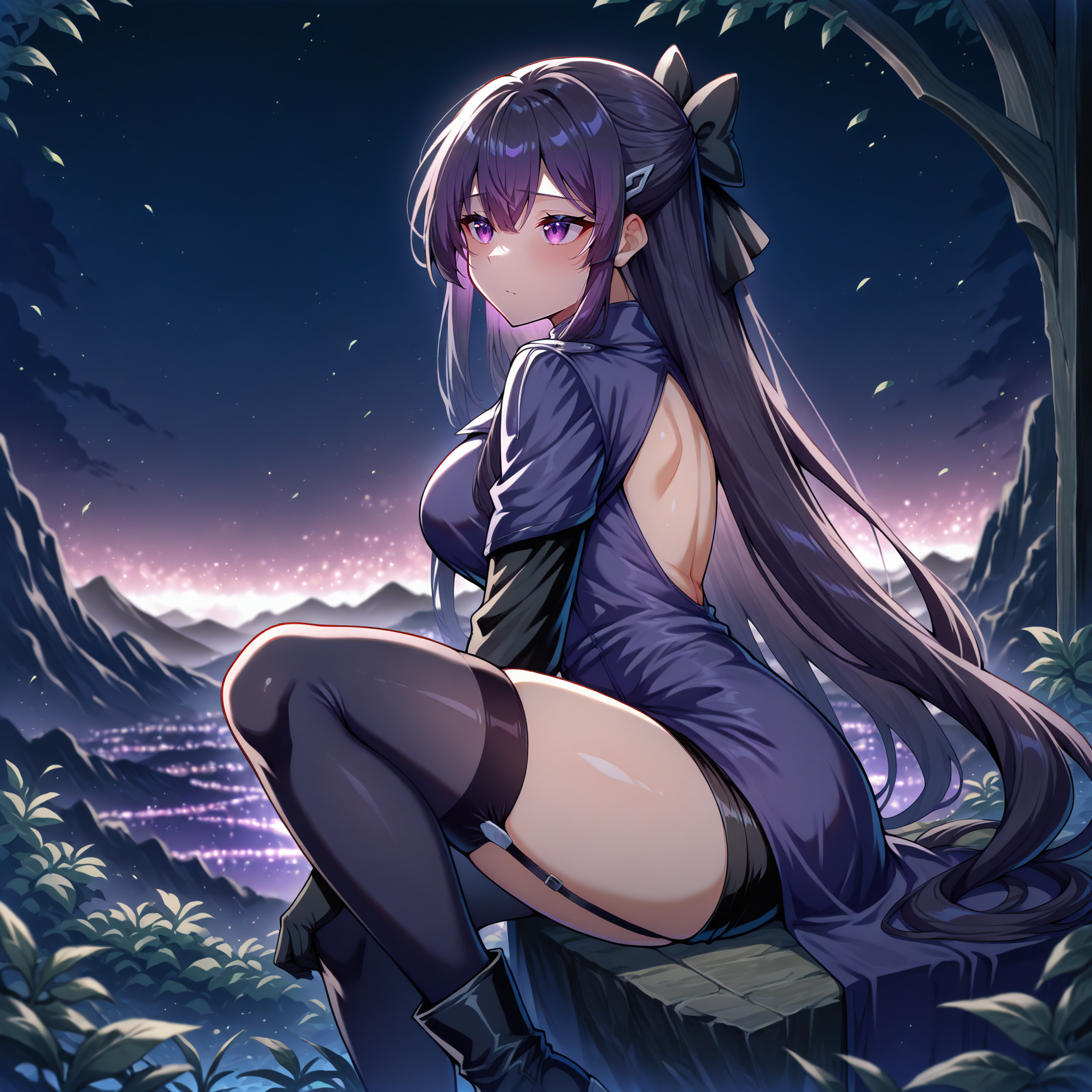 Outfit Prompts hair ornament, hair bow, black bow, black shirt, bare back, black sleeves, black gloves, dark purple coat, black shorts, short shorts, garter straps, black thighhighs, black boots