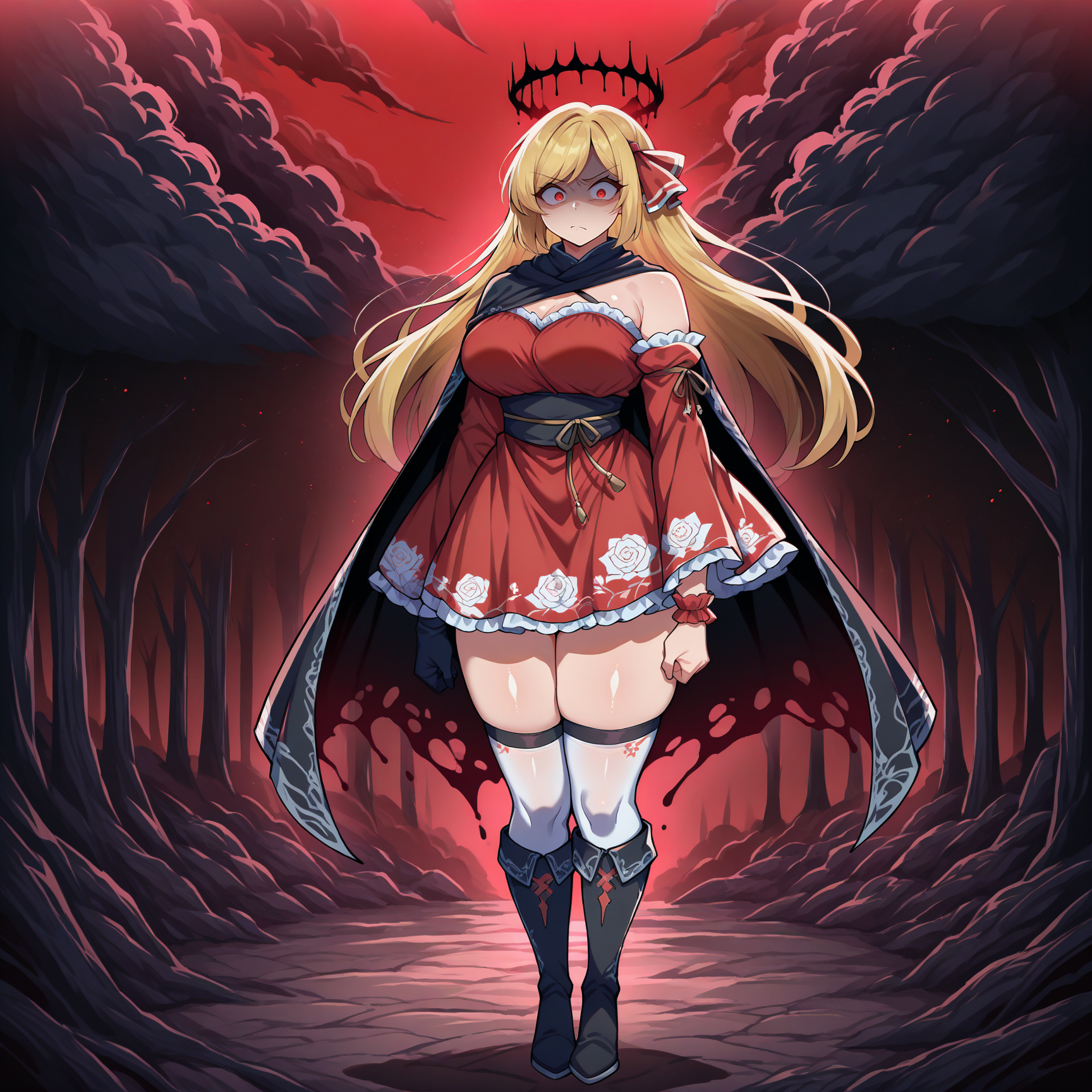 1girl, solo, ex-rumia, blonde hair, long hair, swept bangs, black and red wings, angel wings, black halo, red eyes
